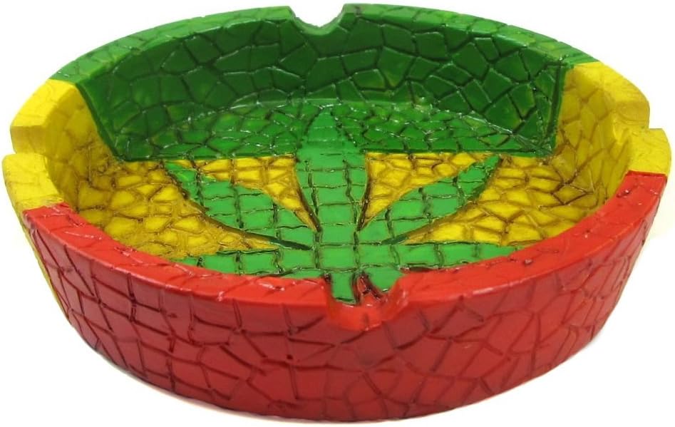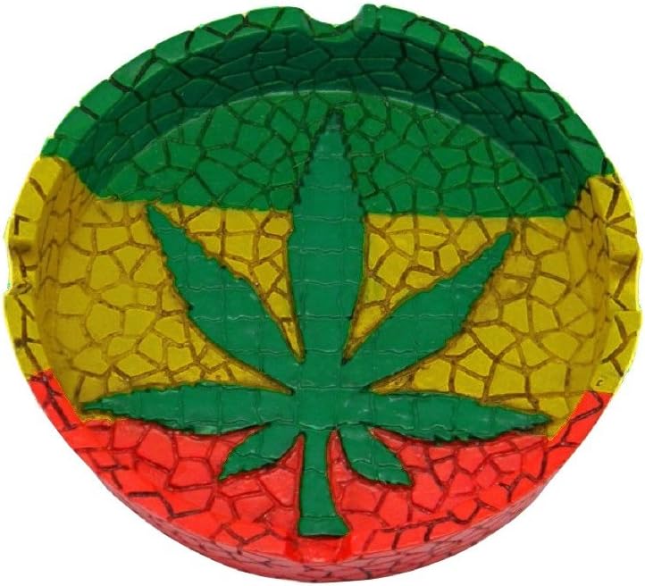 Whether you are a smoker or not, this unique and colorful ashtray will make a great accent to any room. The ashtray is approx. 4 1/4" across and 1" tall. The colors are Rasta colors red, yellow, and green; the inside has a green marijuana leaf. The bottom is black felt lined.