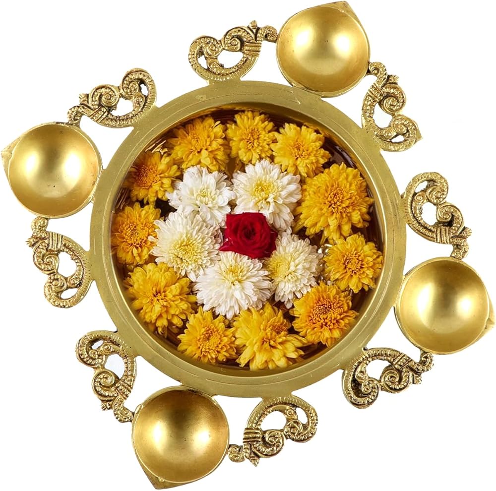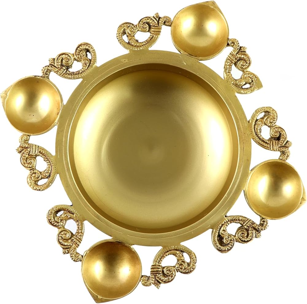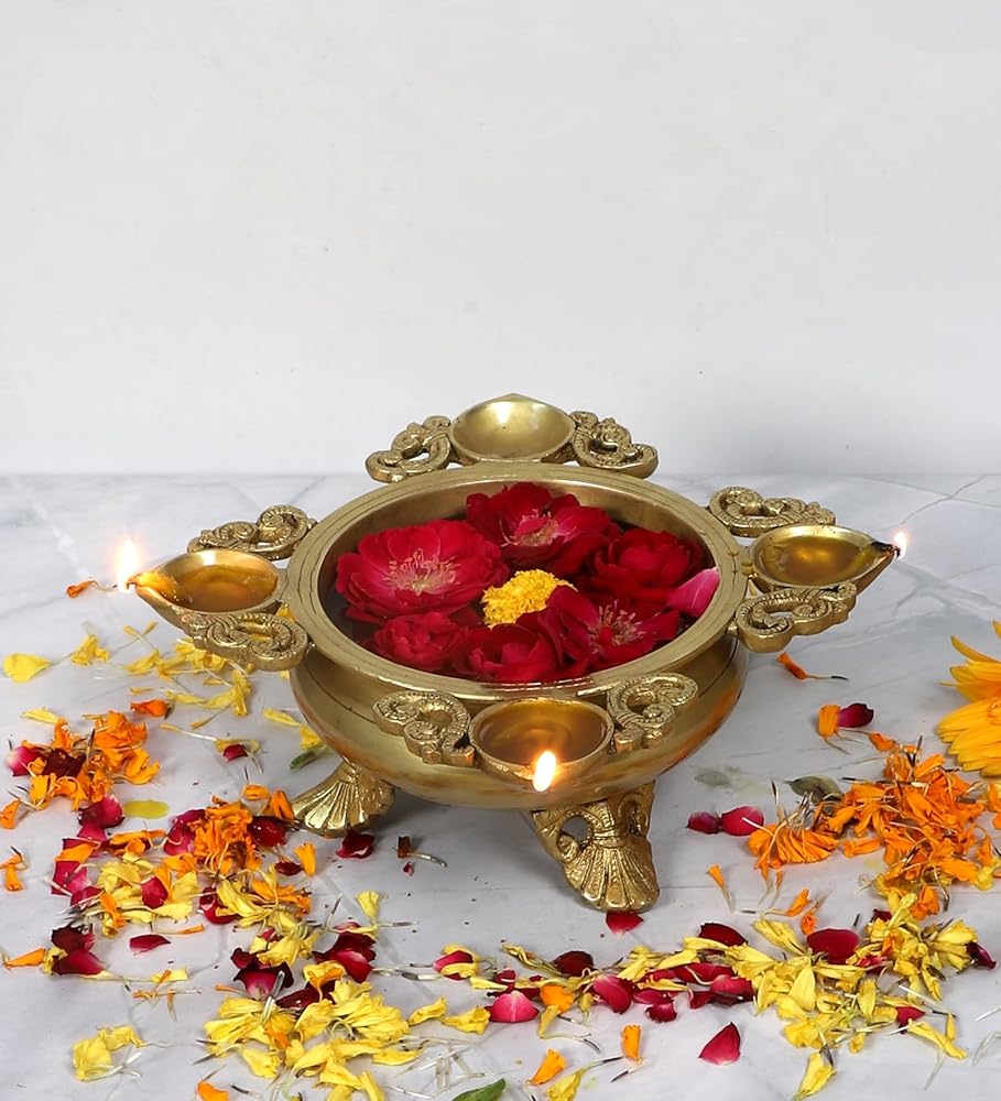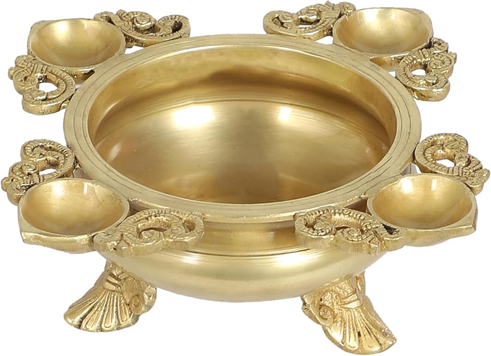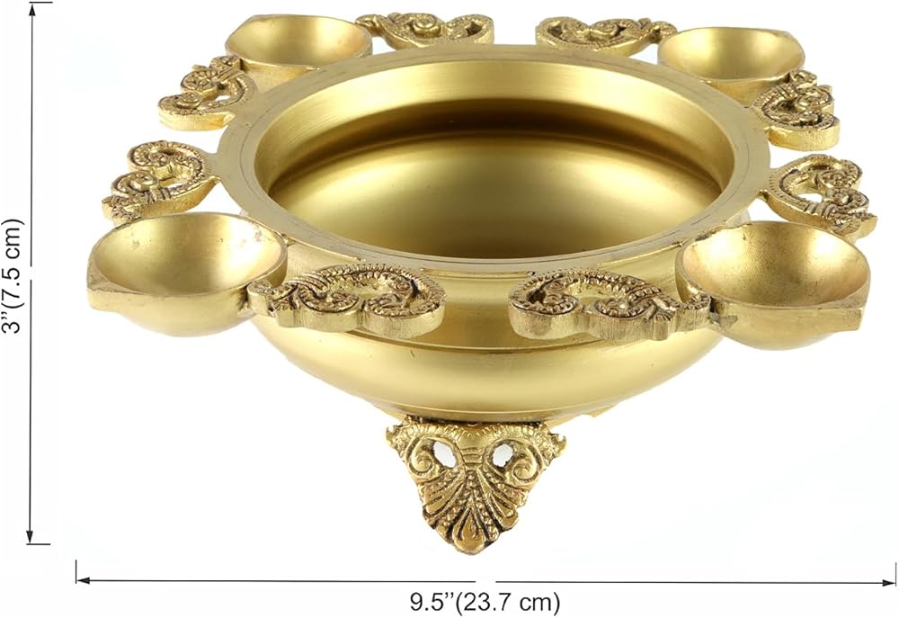 Ethnic Carved Design 9.5 Inches Brass Urli With 4 Diyas for Home Decor, Gifts for Housewarming, Flowers, Standard, Pack Of 1
