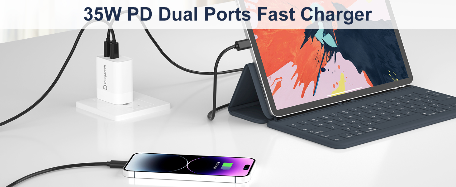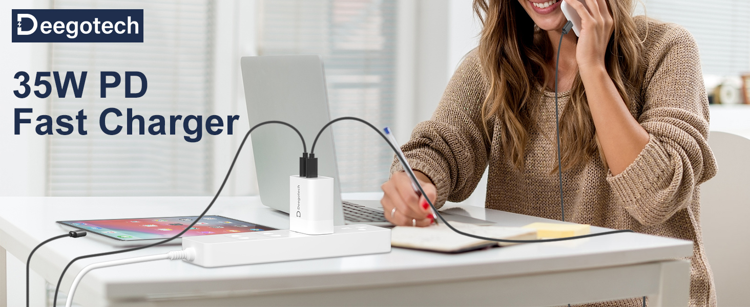 [Dual USB C Ports] Deegotech 35W USB C Charger block is designed with 2 USB-Cports, charge 2 devices at the same time. Charging with one port output 35W max. 2 ports charge at the same time, USB c port output 18W max