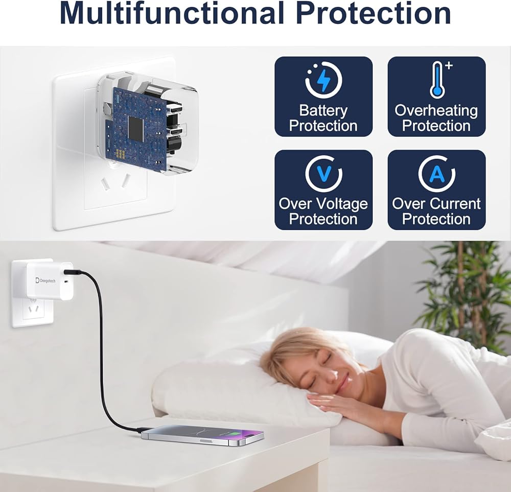 [Safe & Durable] Deegotech USB c fast charger supports PD and PPS certification, and can distribute current intelligently, providing targeted input current for different mobile devices. Provides overcurrent, overheating and overcharge protection for the device, which can effectively protect the battery life