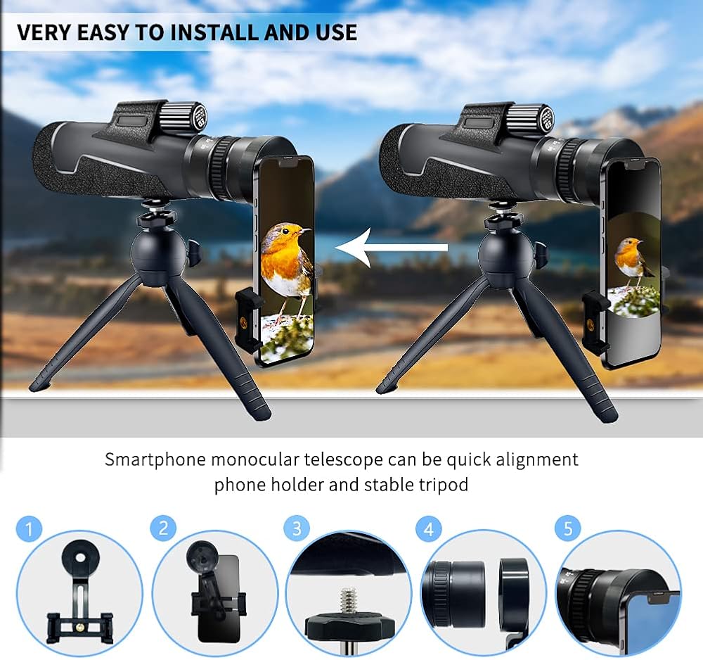【Smartphone Holder & Adjustable Tripod】 - Monocular Telescope for Smartphone can be quick alignment phone holder and stable tripod, Very easy to install and use. Compatible with any smartphone and provide HD images to share with friends.
