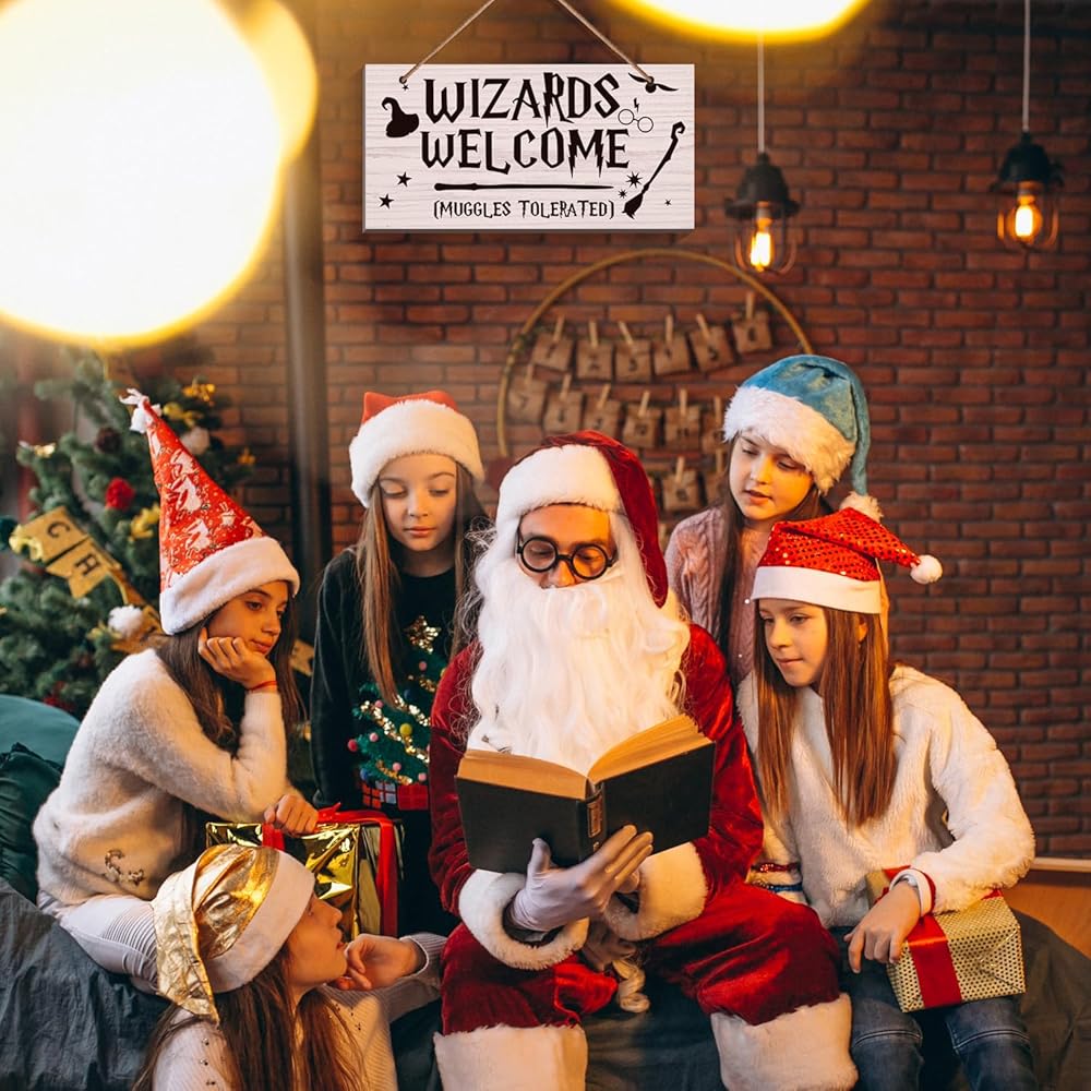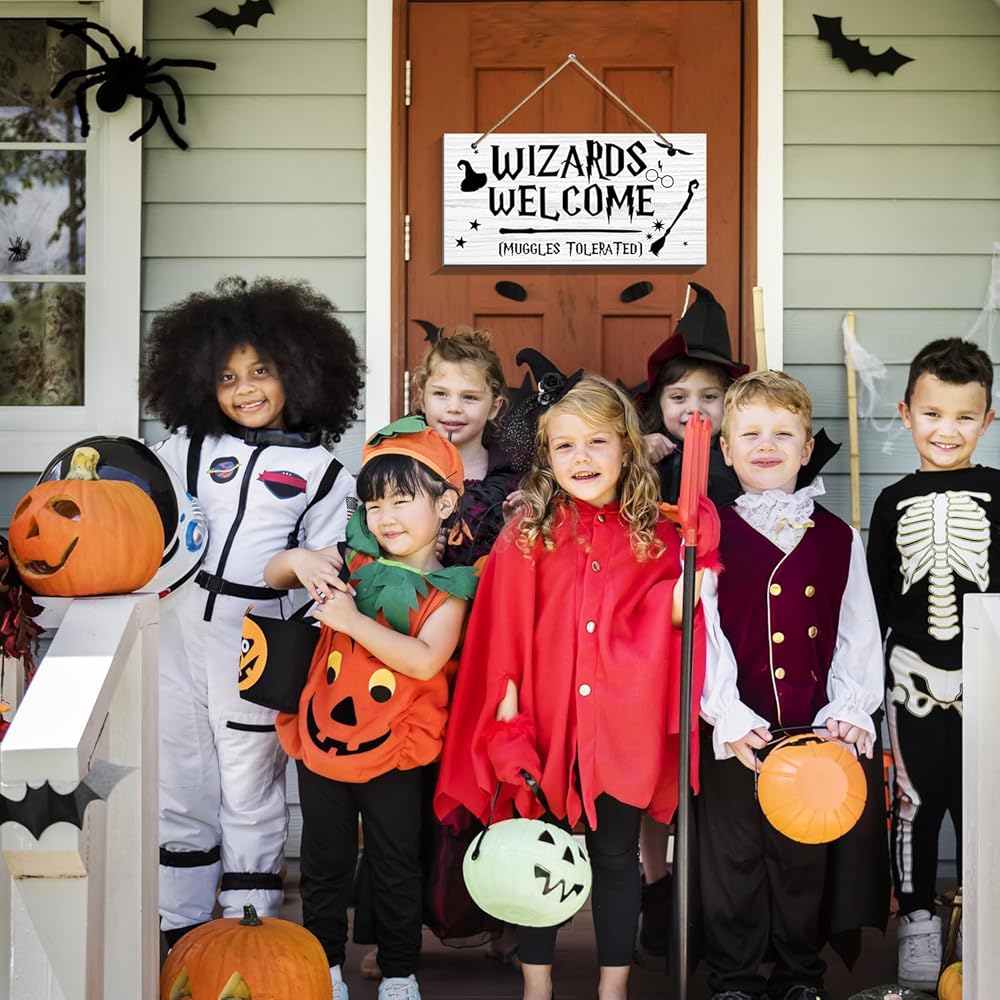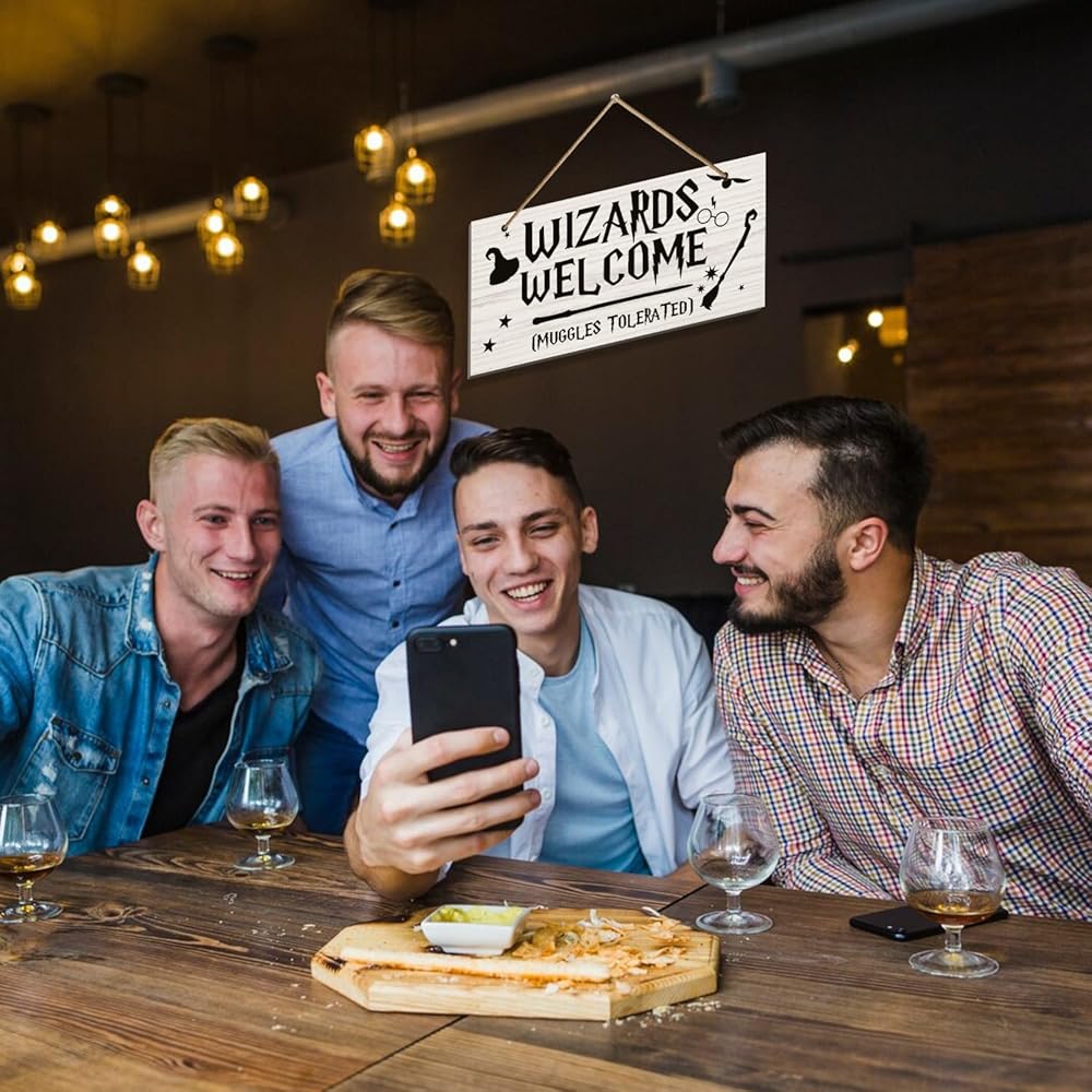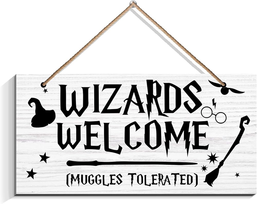 علامات باب متسامحة مع أكواب الترحيب من Wizards - لافتات خشبية مطبوعة على الحائط، لافتة ترحيب مضحكة كهدية لديكور المنزل، الهالوين، زينة عيد الميلاد (6 × 12)