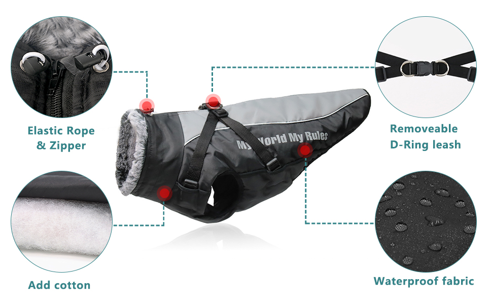 User-Friendly Design - dual D-Ring leash attachment allowing you to securely attach a leash without needing another harness or collar; Adjustbale furry collar offer warmth; Big opening on the belly allows them to pee and poo without taking it off