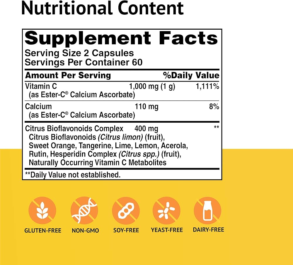 American Health Ester-C with Citrus Bioflavonoids Capsules - 24-Hour Immune Support, Gentle On Stomach, Non-Acidic Vitamin C - Non-GMO, Gluten-Free - 500 mg, 60 Count, 30 Servings