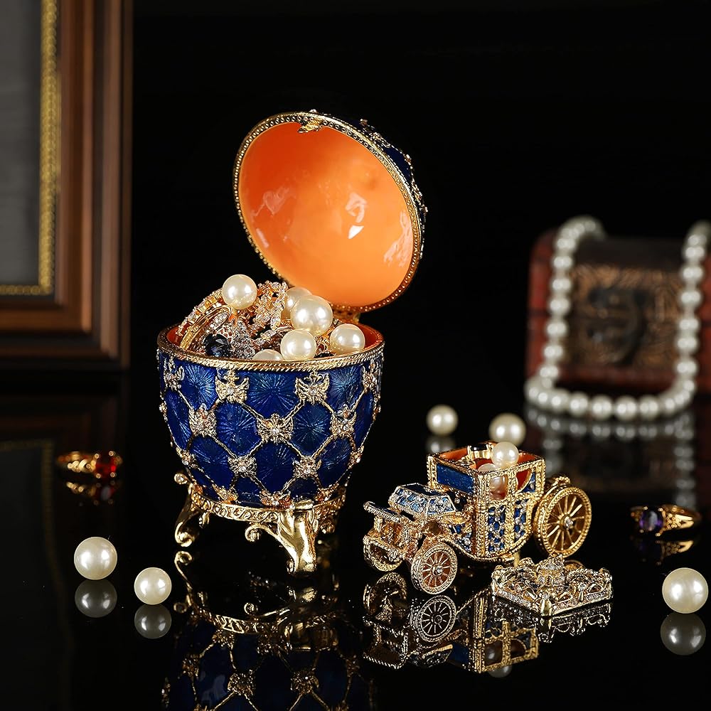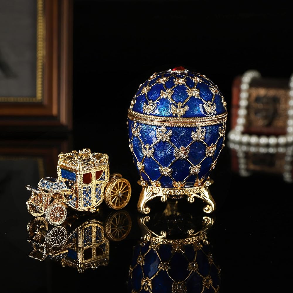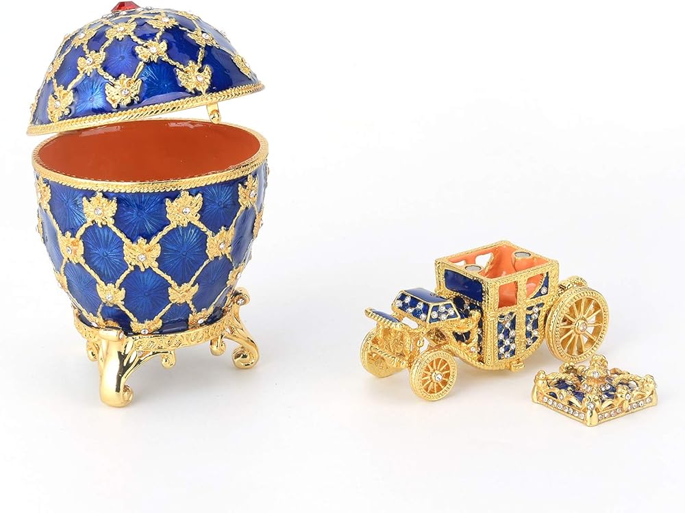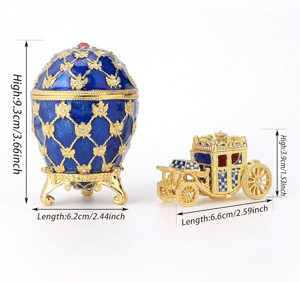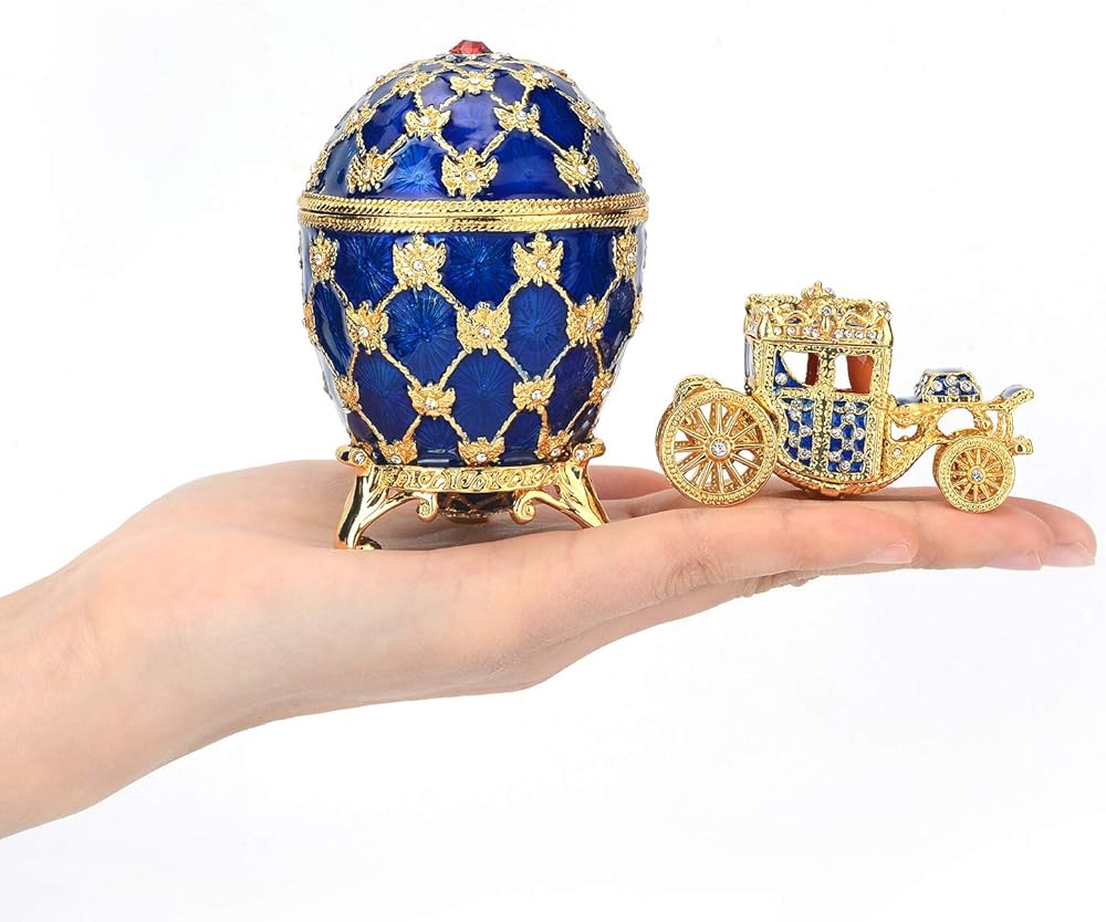 QIFU Vintage Blue Easter Egg Style Jewelry Trinket Box with Mini Royal Carriage, Unique Gift for Easter Collection