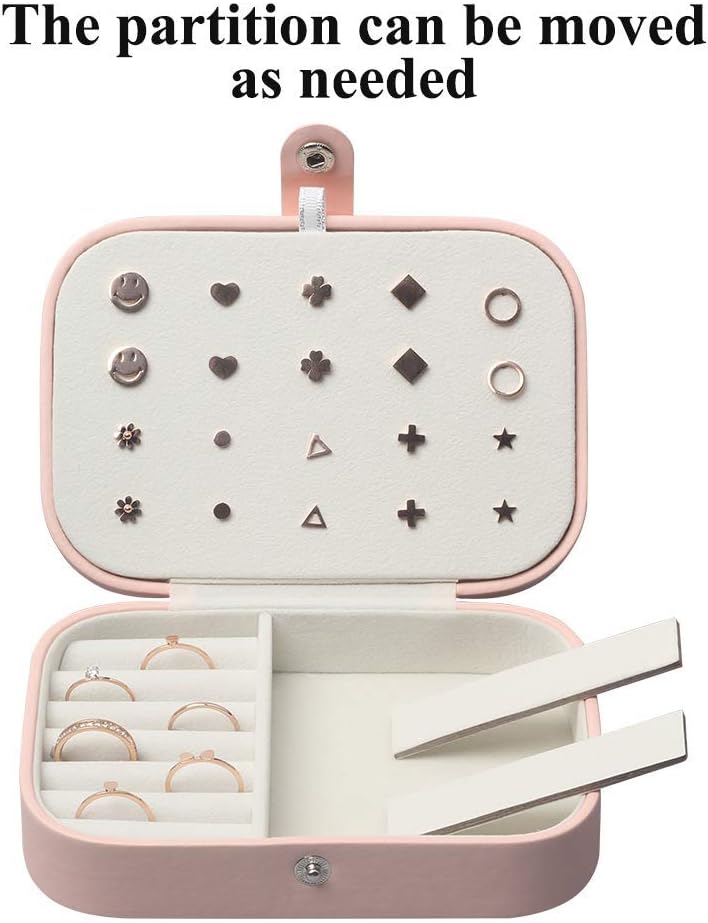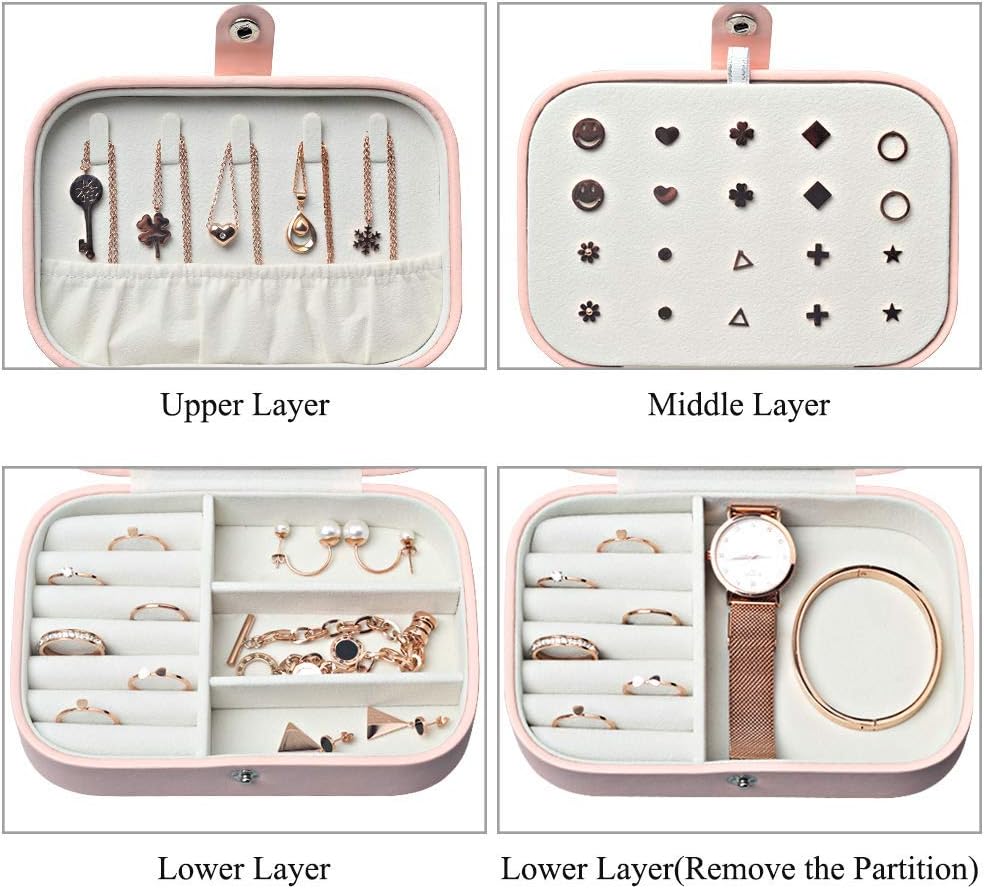 🌠High Capacity: Bottom part has 7 ring rolls for rings, earrings, studs, cross bar dividers offer 3 small compartments and also removable for holding bracelets;The middle section can holder 10 pairs earrings;Top lid section has 5 hooks and lower elastic pocket to keep necklace, bracelets perfectly in place.