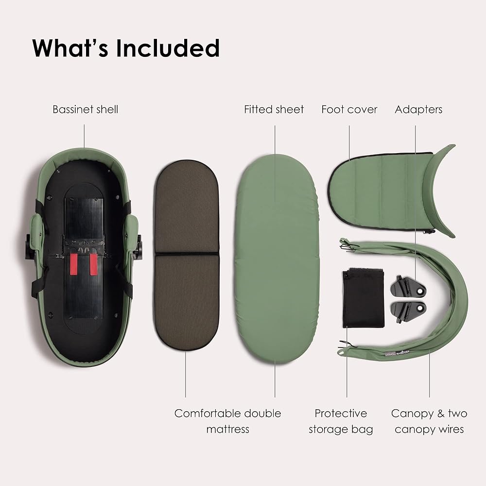 • WHAT'S INCLUDED - The Bassinet includes the semi-hard shell, a double mattress, fitted sheet, foot cover, anti-UV canopy, two canopy wires, and adapters for the frame.