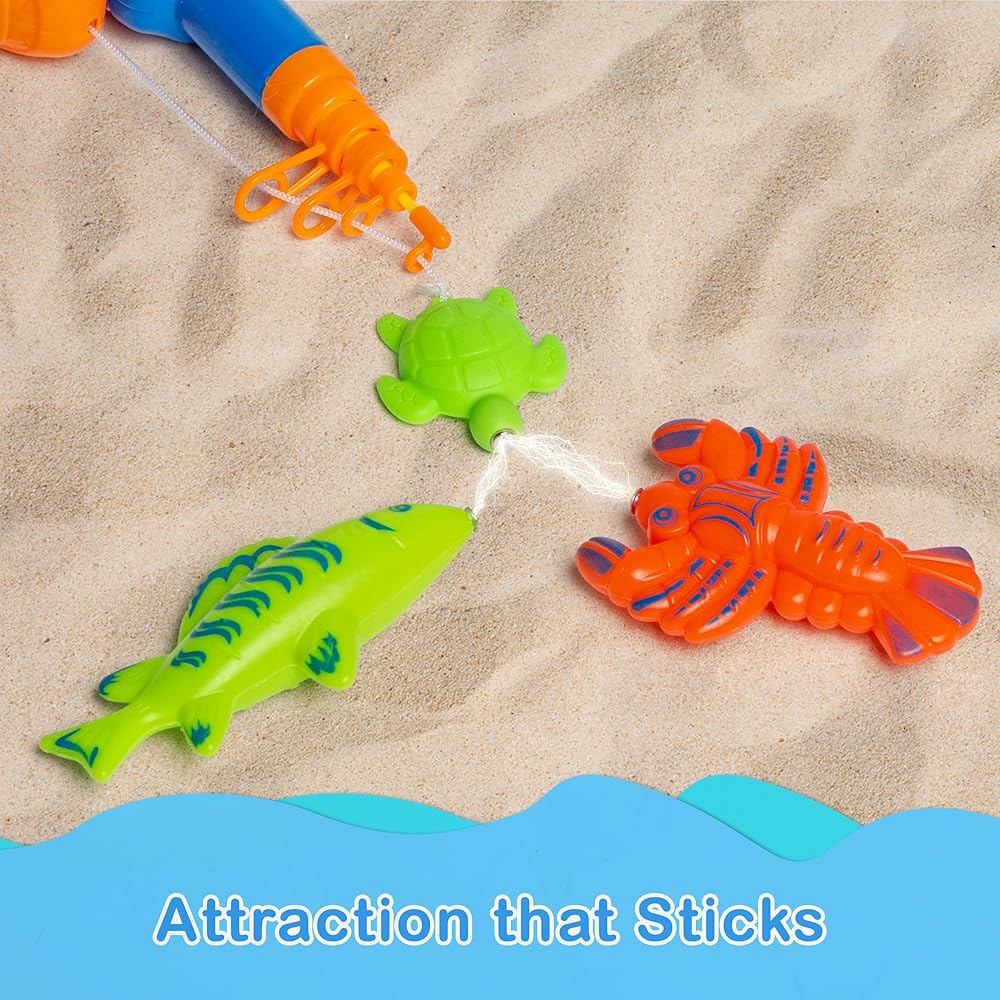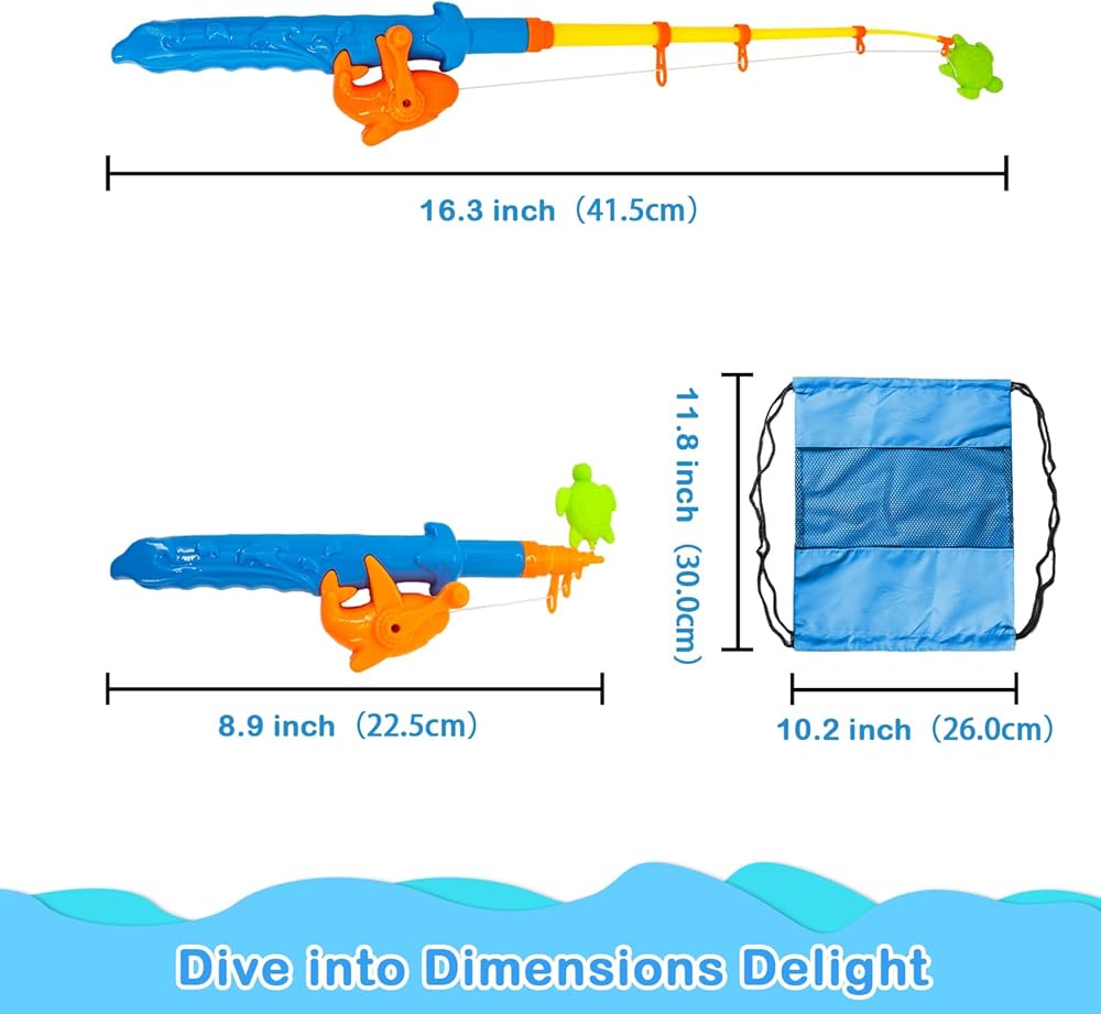 Let's go fishing- The fishing toy set come with a fishing pool. The fishing pool is deep enough, you can add water or sand into it. The storage bag is for packing up and taking outside to backyard, swimming pool, park, beach, seaside, camping and so on. You can dry and store these fishes easily by this mesh storage bag.