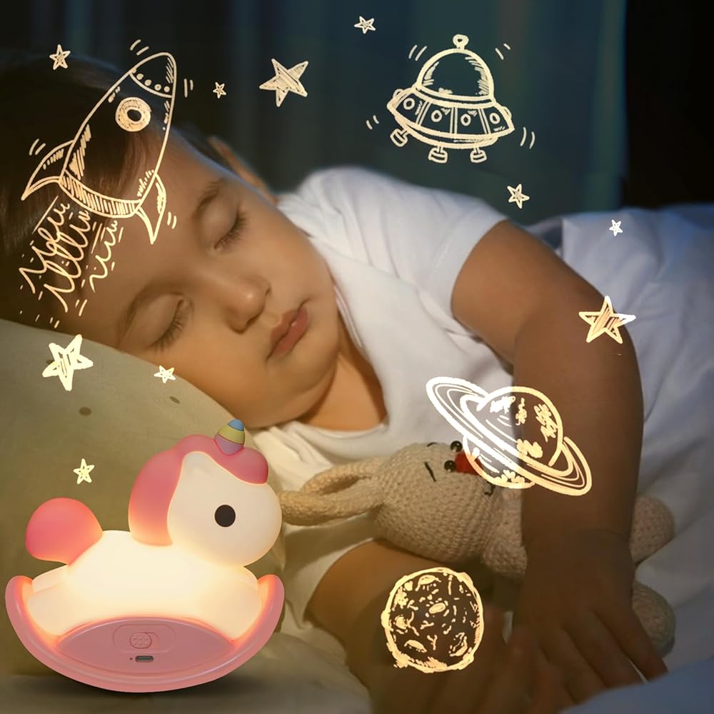 Safe & Soft Silicone Night Light: CE, RoHs and FCC certificated. This unicorn lamp is super cute and soft, made of 100% safe and kid friendly silicone and ABS material. Unicorn night light are the perfect bedtime buddies, traveling companions cute night light for kids, it's also as a unicorn bedroom decor for girls.