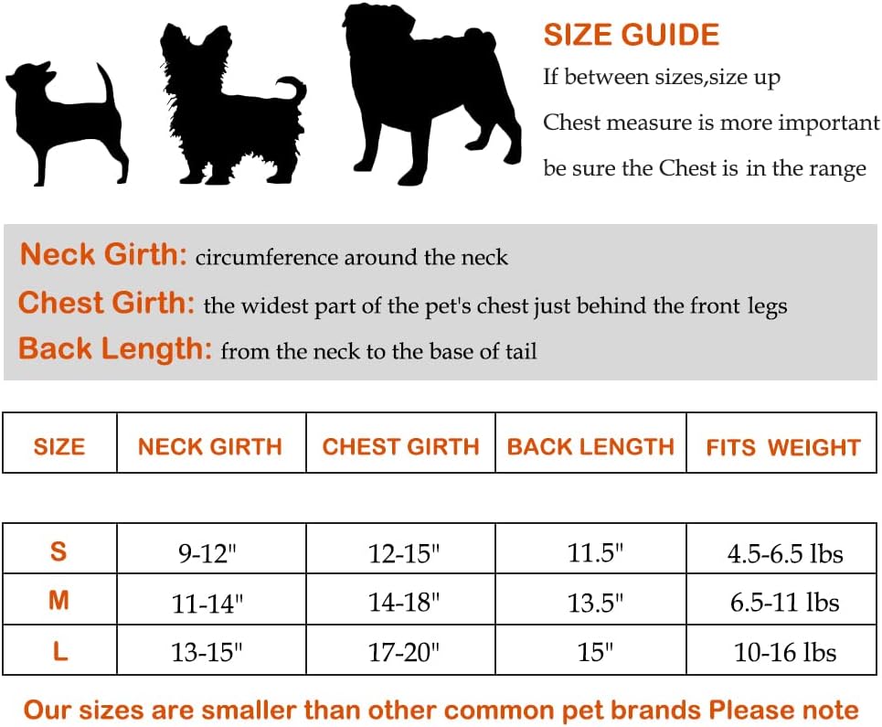 Size S:------Neck Girth(9"-12")--------Chest Girth(12"-15")-------Back Length(11.50")------Fits Dog Weight(4.5-6.5 lbs)