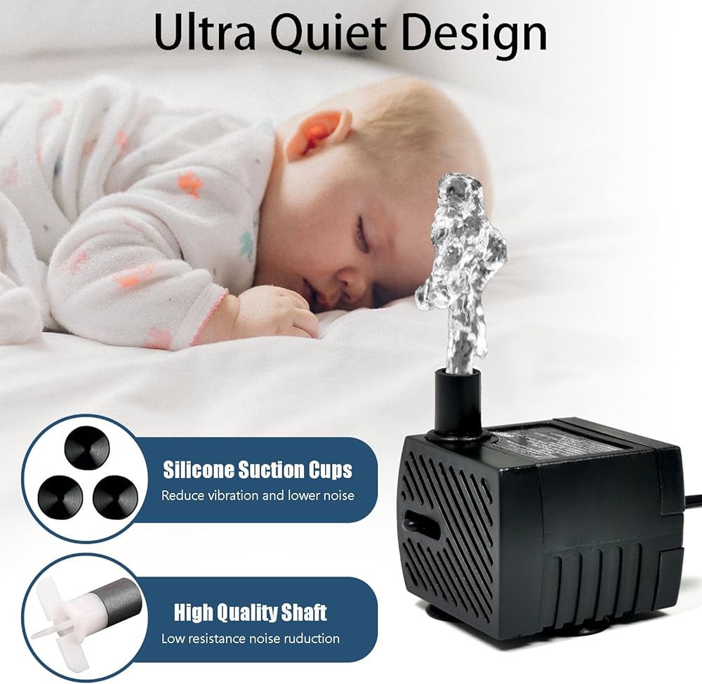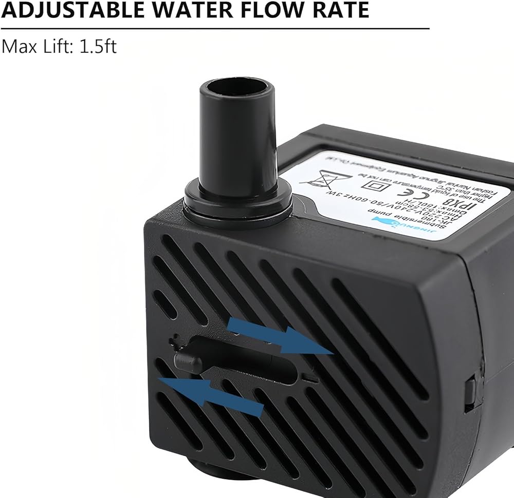 【Adjustable Flow Rate】 Designed with a adjusting knob, water pump can adjust the water flow rate, the maximal flow rate can be up to 160L/H. It can elevate column of water up to 1.5ft after installing water hose.