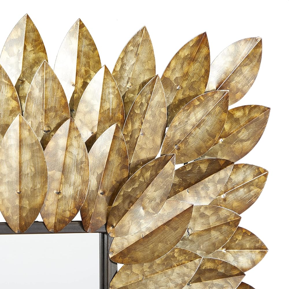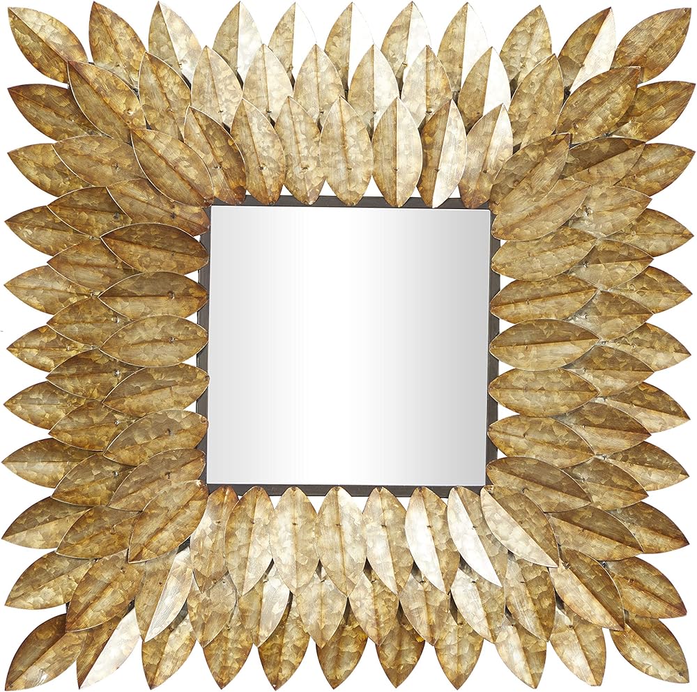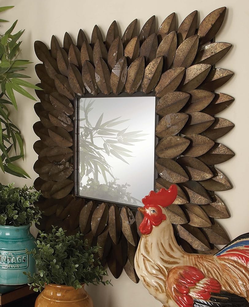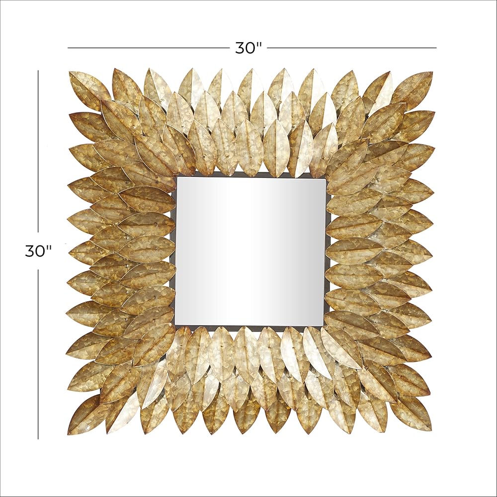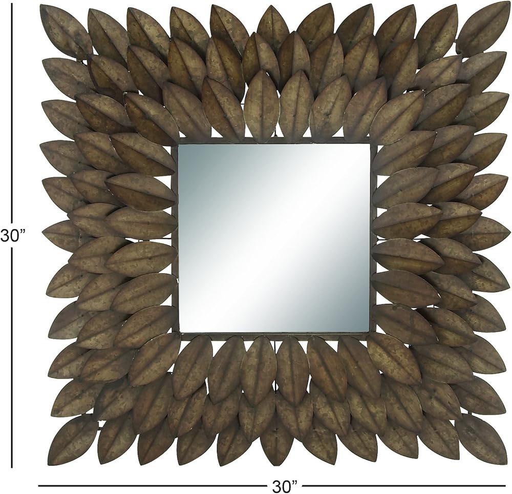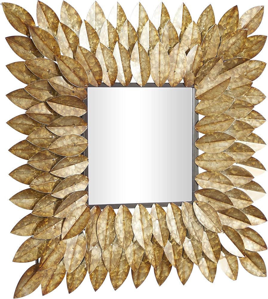 FEATURES SQUARE WALL MIRROR: Decorative brown mirror with layered tin leaves with textural and distressed metallic gold finishes in 3 layers wrapping around the reflective interior mirror