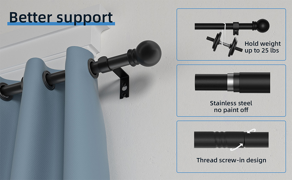 【مادة متينة】قضيب الستارة مصنوع من معدن الستانلس ستيل شديد التحمل والسطح مصنوع من نسيج مصنفر، سمك قضيب الستارة الأسود 0.7 ملم والقطر 5/8 انش.
