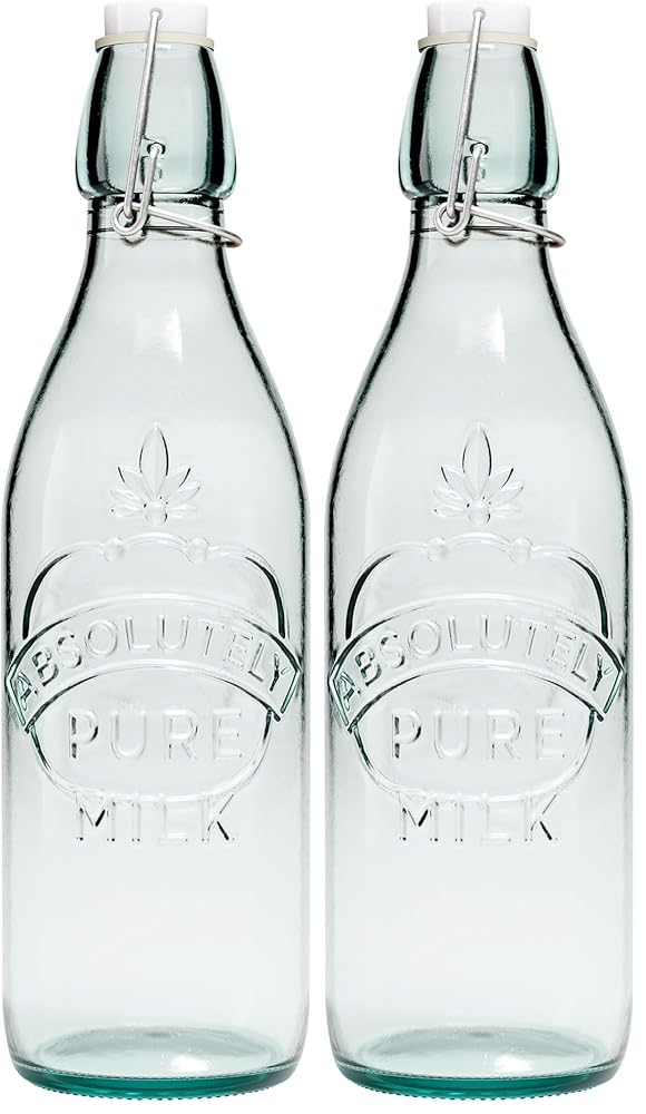 ENJOY YOUR FAVORITE BEVERAGE - Need a pretty glass milk bottle for your kitchen? A decorative vessel for wine or eggnog? Something to serve lemonade to the kids? Perhaps a flip top glass bottle for homemade gin? Look no further!