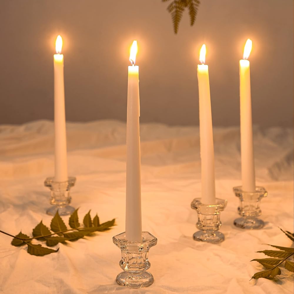 【Candle Holder Size & Package】Set of 6 Glass Taper Candle Holders. Each holder measures 1.7" x 1.7" x 2.36". For use with taper candles with a diameter approx 0.9"