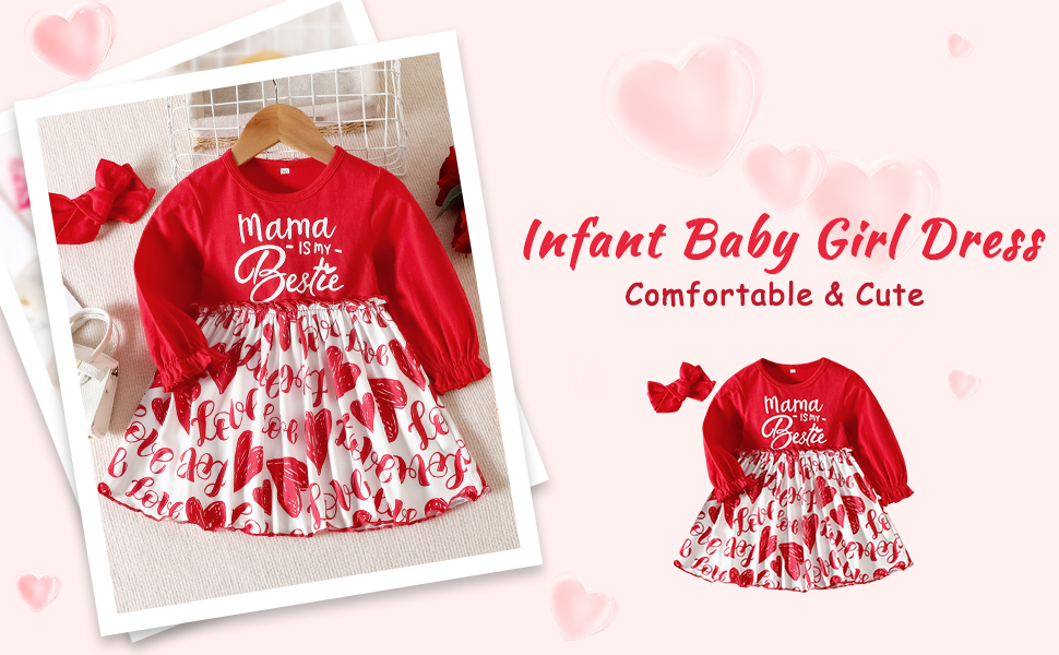 ❤Cute Design: Toddler baby girl Valentines Day dresses, heart print and mama's bestie letter print, splicing dress, A- line dress, cuff waveselvedged design. Stylish and cute design makes your baby look more sweet and attractive, she would it a lot!