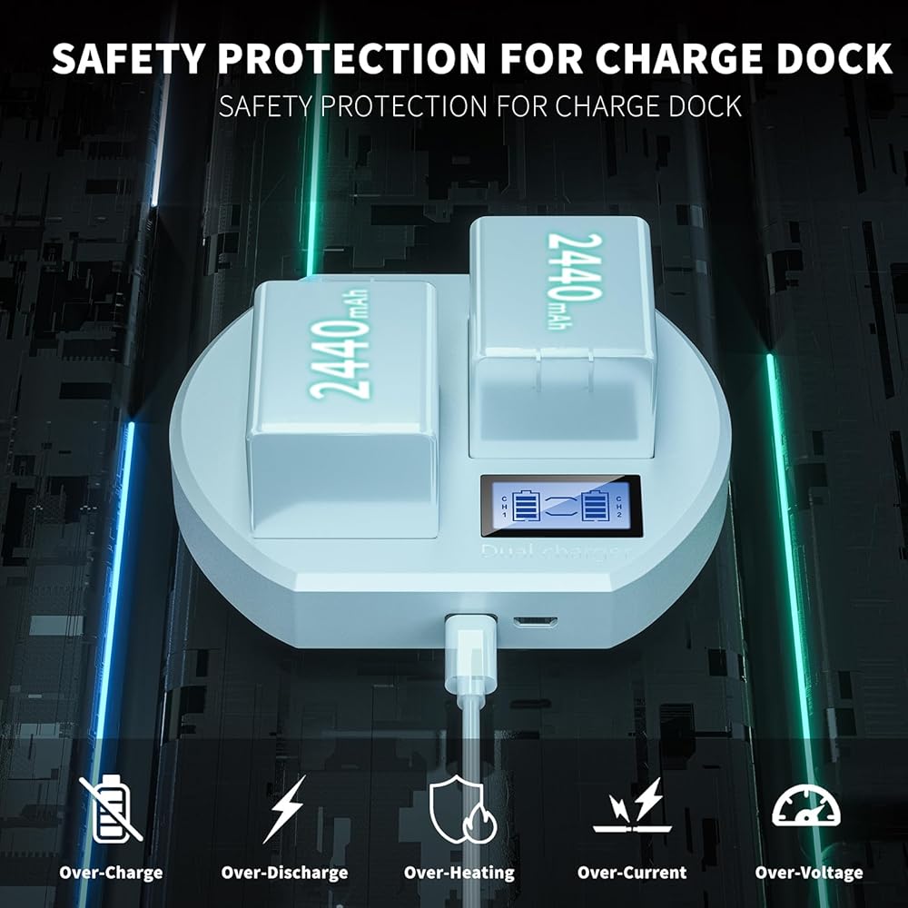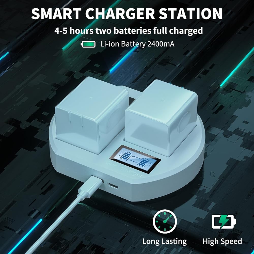 【LCD Display】Taken charger LCD display monitor the charging status of each battery, 0~100% power display, let your camera work anytime and anywhere.
