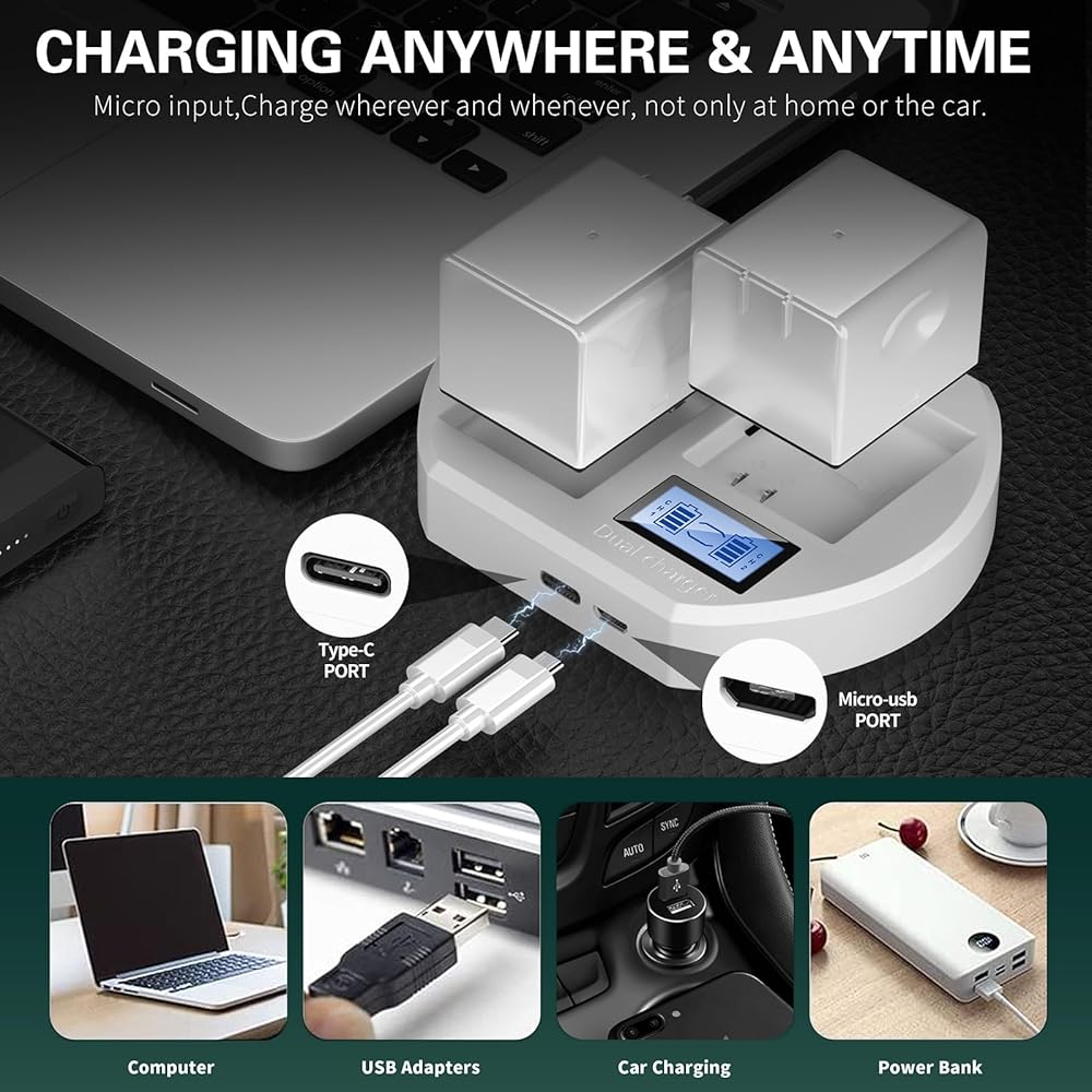 【Dual Charging Port】2-Bays battery charger comes with Type C & Micro USB input port and a Micro USB extra cable, which can be connected to any power supply with 5V USB port, laptop, AC adapter, car adapter, power bank, etc.