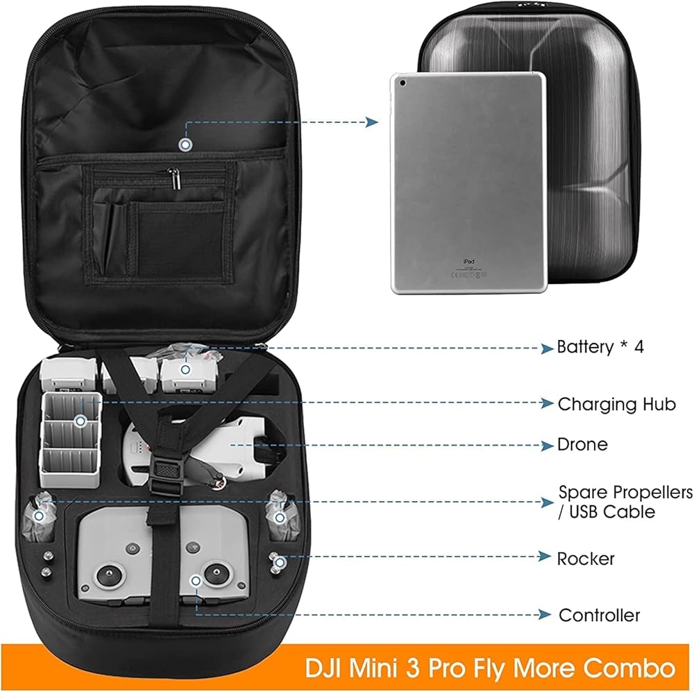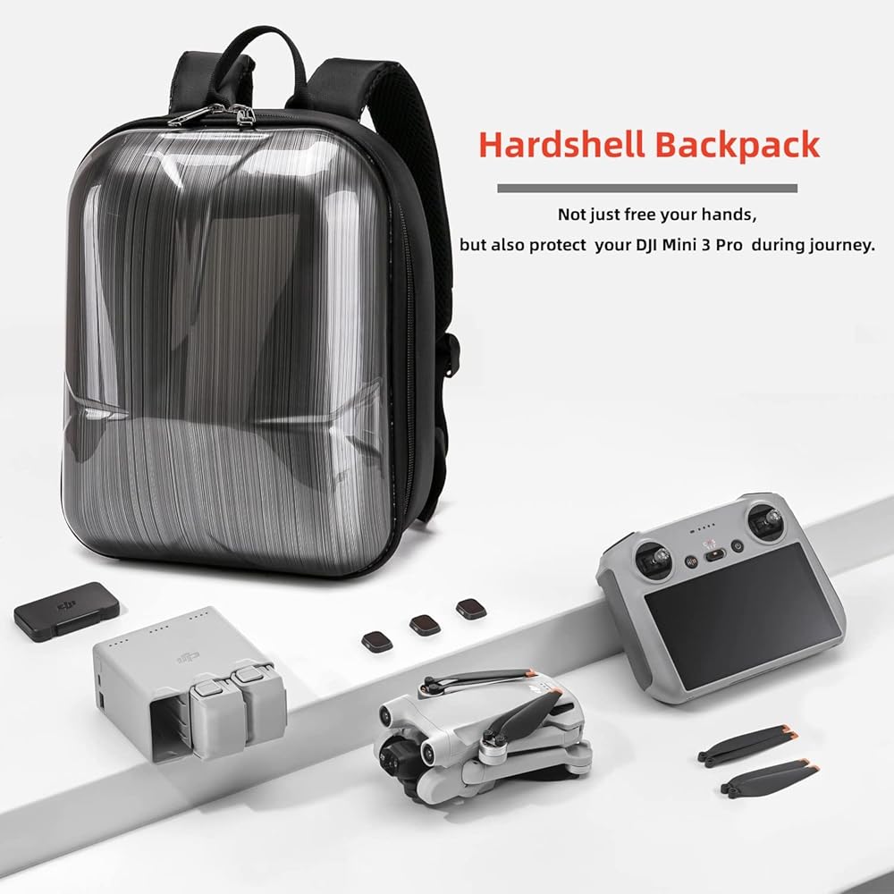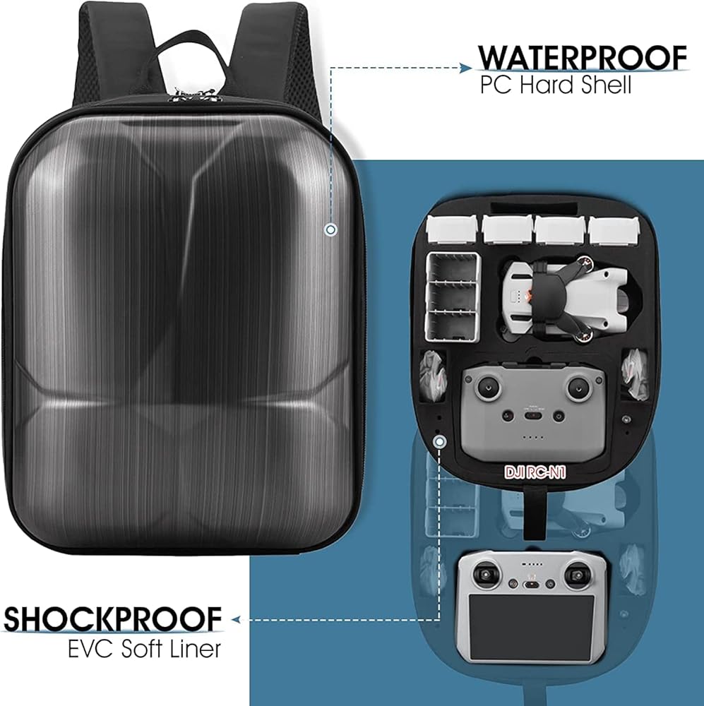 Made with PC hard shell and EVA soft internal foam, this drone backpack is waterproof & shockproof and can store DJI mini 3 pro drone, 7x DJI Mini 3 Pro Batteries (1 battery installed on drone), 1x DJI RC/RC N1(with or without screen), 1x Charging Hub, RC Cable, Filter, Propellers and other drone accessories well.