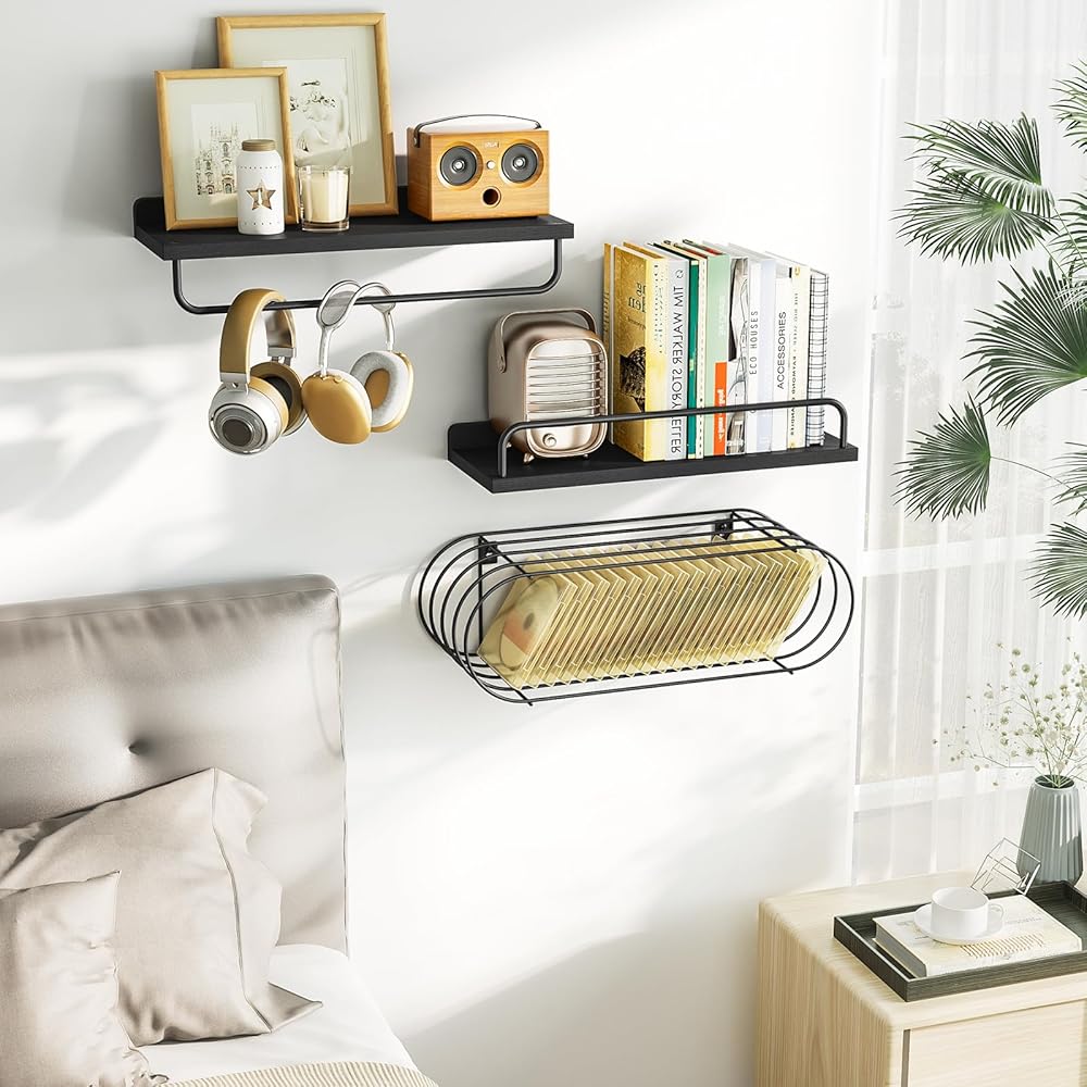 2+1 Tier Wall Shelves - This set includes two wooden shelves and one metal wire basket. These display shelves also allow you to make full use of the wall space and provide more storage space for your photo frames books plants and other items. You can combine or separate them and install them in various rooms. Whether it's in the bathroom bedroom or kitchen it's a stylish and practical choice.