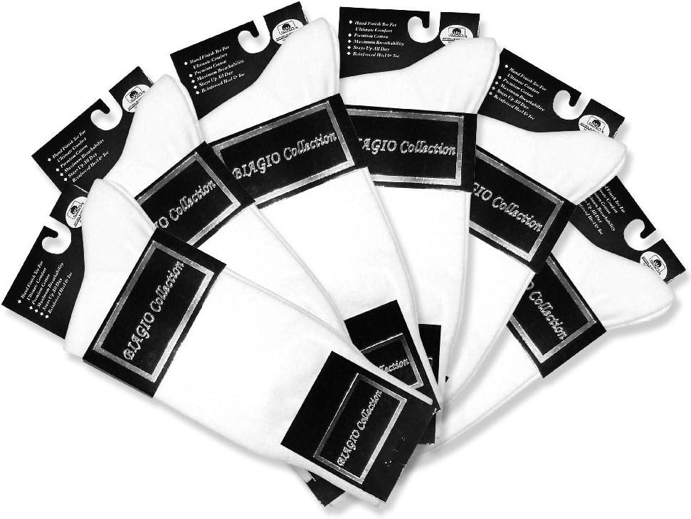 6 Pairs of New Biagio Brand Men's Cotton Socks This listing is for SIX PAIR of WHITE color Biagio Brand Cotton Socks. Fiber Content: 80% Cotton, 15% Spandex, 5% Elastin Fits Sock Size: 10 - 13 Fits Shoe Size: 6 - 12 This is a standard length pair of Mens Dress Sock. Hand Finish Toe for Ultimate Comfort Premium Cotton Maximum Breathability Stays Up All Day Reinforced Heel & Toe Natural Blend Cotton Hand Finished Toe Seam We a have a variety of Socks in our other listings.