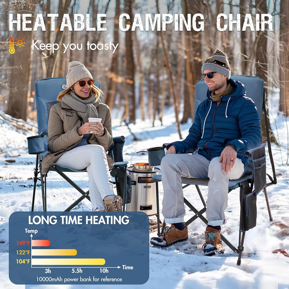 Heated Camping Chairs with 3 Heating Levels: Both seat and back have built-in heating system to provide you with full warmth and comfort. The temperature is adjustable to suit different environment (122°F/ 113°F/ 104°F). And the folding chair will heat up in just 8s. With it, you could enjoy outdoor sports and activities in cold weather with ease! (USB battery NOT included.)