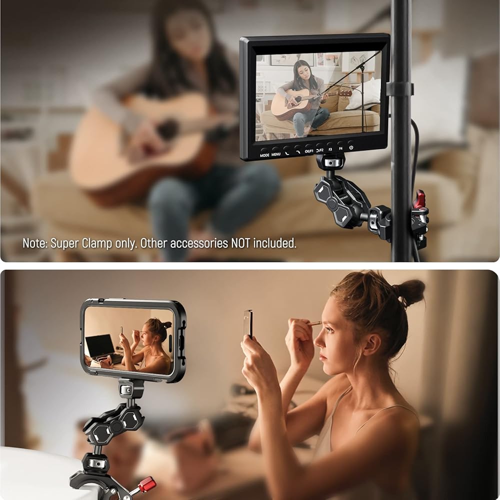【Diverse Attachment】 Attach a Speedlite, mirrorless camera, action camera, monitor, or LED video light to the clamp via the cold shoe mount or 1/4" & 3/8" threads. Compatible with SmallRig magic arms and ball head arms, compatible with GoPro insta360 action cameras, and compatible with Feelword field monitors and NEEWER Mini LED Lights