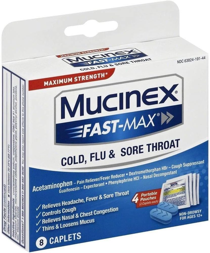 Send your cold and flu away with Mucinex Fast-Max Cold, Flu & Sore Throat Caplets, so you can feel better and move on. Mucinex Fast-Max Caplets. Mucinex Fast-Max Cold, Flu & Sore throat Caplets combine the mucus-busting power of Mucinex and other maximum strength medicines to relieve headache, fever, and nasal congestion, control cough, and break up and thin the mucus that causes chest congestion.