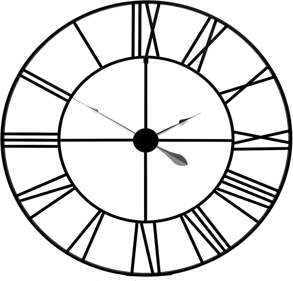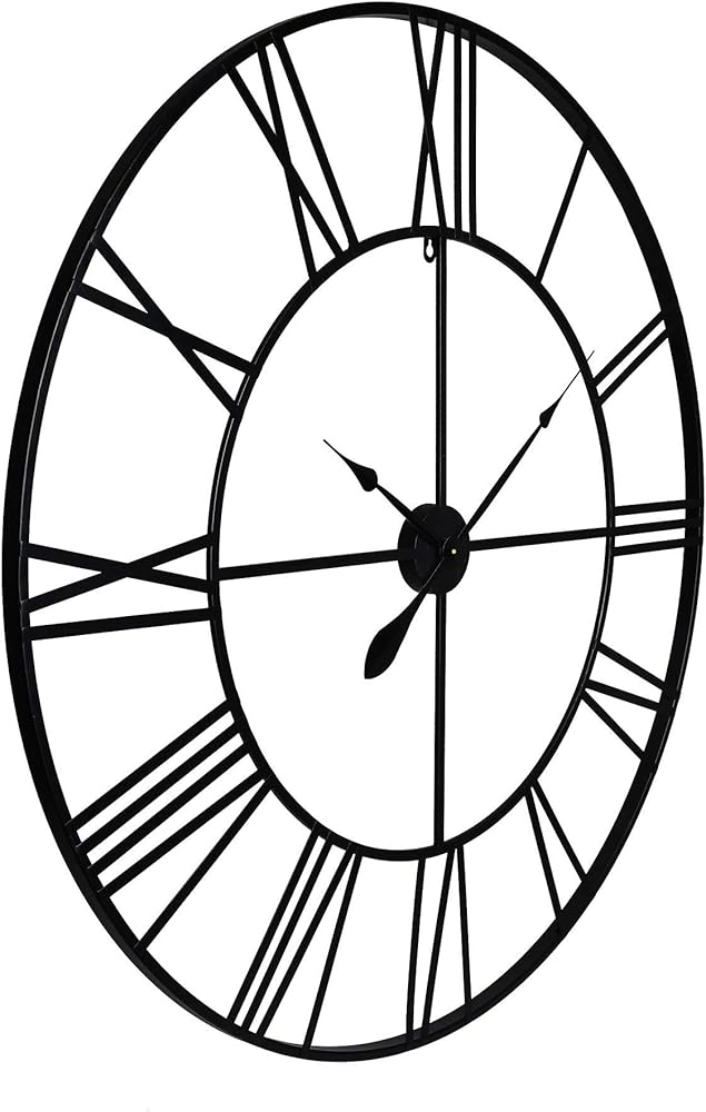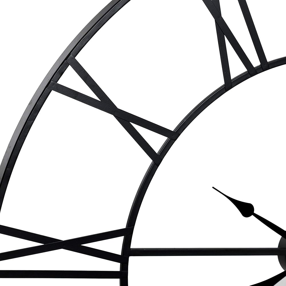 The modern cutout design and antique style accents of this oversized wall clock create a classic statement piece with contemporary flair. The Metal Cutout Roman Numeral Wall Clock features a sleek narrow open cut-out face measuring 36 inches around and 1 inch deep. Large roman numerals are both tastefully artful and easy to read in a black finish. Finished in a matte powder coat, it's cutout clock face design creates an elegant floating shadow effect on any wall. It can be hung securely to any wall surface with metal hangers on the back. Bring this farmhouse modern time keeping focal point into your space.