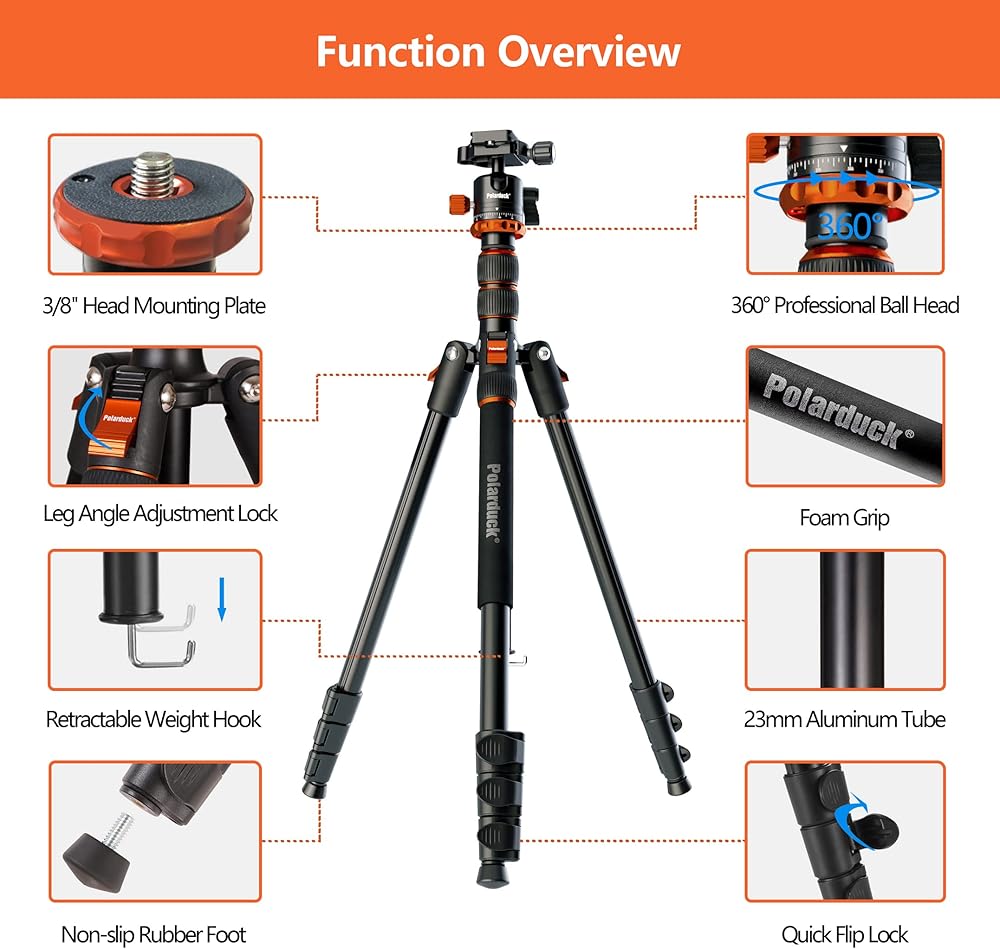 HIGH-QUALITY and STURDY: Polarduck camera tripod is made of supreme aluminum alloy and weigh only 3.2lbs (1.45kg), lightweight but durable. The maximum load capacity is 22lbs (10 kg), suitable for most common devices. And 20 inches (51cm) folded size makes it ideal for storage in a travel bag or backpack and take it anywhere.