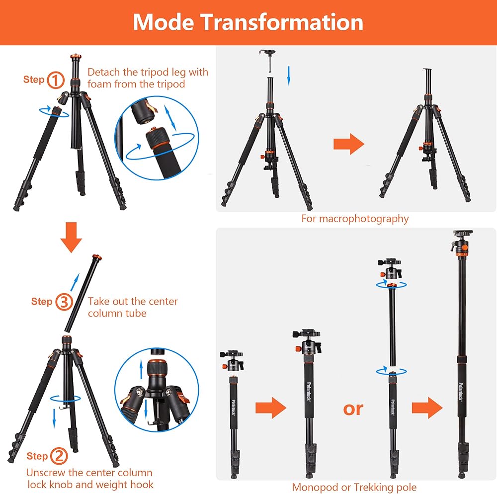 2-IN-1 TRIPOD & MONOPOD: The tripod can be easily turned into monopod or trekking pole with height range 33" to 80", it is a good companion for you to go hiking or traveling. Moreover, the central pole can be inverted to allow for low angle shooting and macro photography, to get closer to the object.