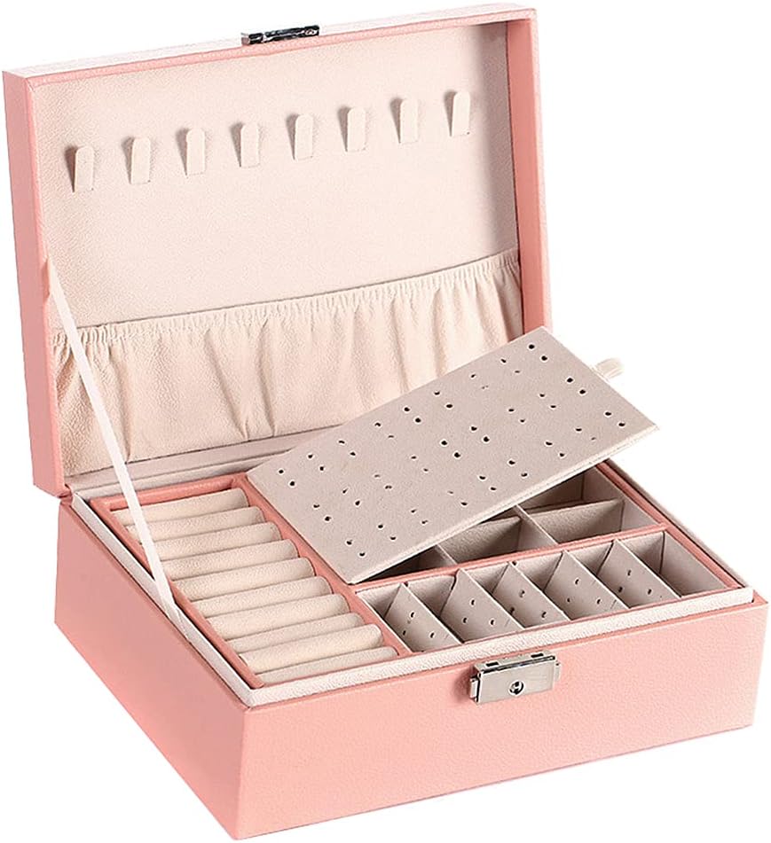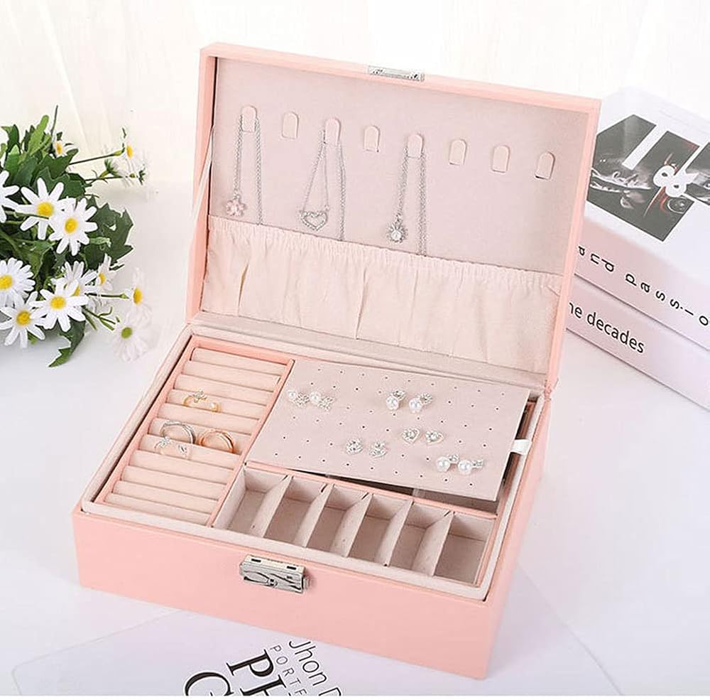 NuAngela Large Jewelry Box Organizer for Women Girls, 2 Layer Jewelry Storage Case, PU Leather Display Jewellery Holder With Removable Tray for Necklace Earrings Rings Bracelets (Pink)