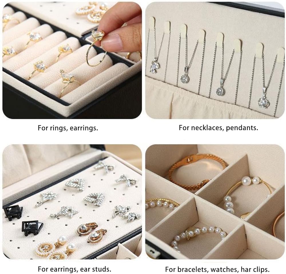 Double Layer Design, Large Capacity - Double layer jewelry boxes offer adequate area for your exquisite accessories. Top lid with 8 hooks for necklaces and pendants; 9 ring rolls, detachable earring organizer hanger, oversized earring plate and 9 compartments below; 6 divided bottom compartments to store rings, bracelets, cuffs, earrings, studs, brooches, watches and other souvenirs.