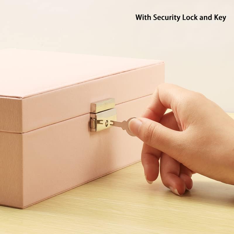 Classical & Luxurious Design-The portable jewelry box is 9*6.7*3.54 inches, with security lock & key. The medium jewelry organizer is covered in PU leather, which is odorless, water-resistant and abrasion-resistant, making it easy to clean. The jewelry case is sturdy and durable enough to withstand heavy jewelry and cosmetics. The soft flannel inside keeps your jewelry well protected from dust, fingerprints, scratches and damage.