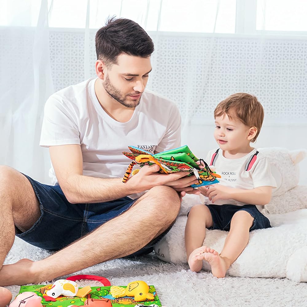 Jollybaby Sensory Touch and Feel Crinkle Books for Baby 0-6 Months,2 PCS Jungle Farm Tails Montessori Car Set Toys for Tummy Time Newborn 6-12, Soft Fabric Cloth Books for Infant 1 Year Old Gift