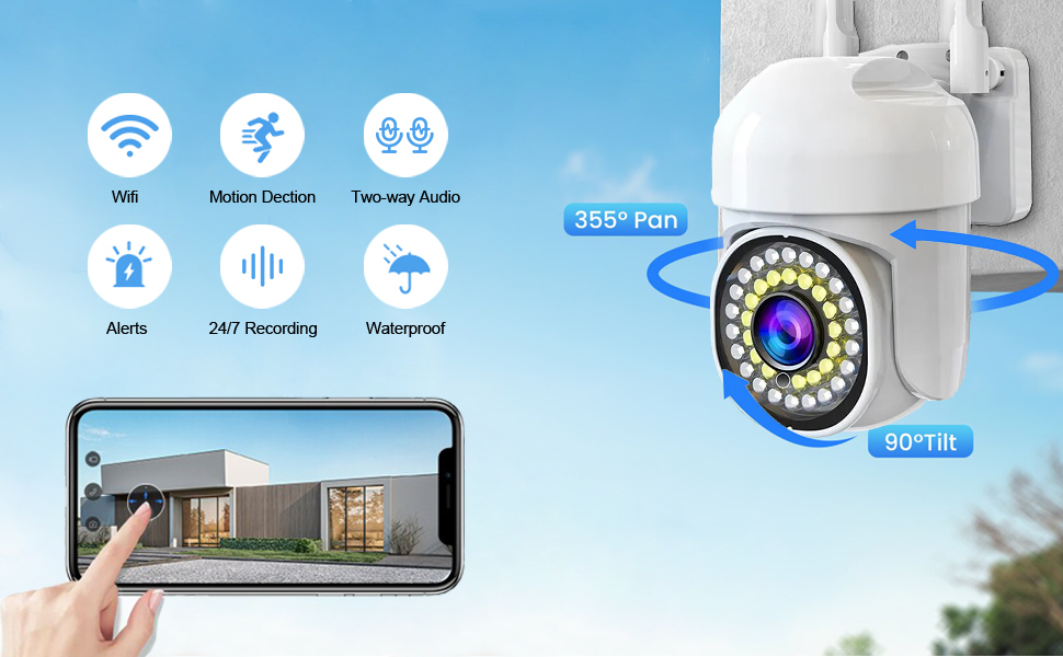 【360° View & 1080P HD】Experience crystal-clear video quality with this camera's 360° view and 1080P resolution. With PTZ technology, you can remotely control the camera's position and view every angle of your property with ease.