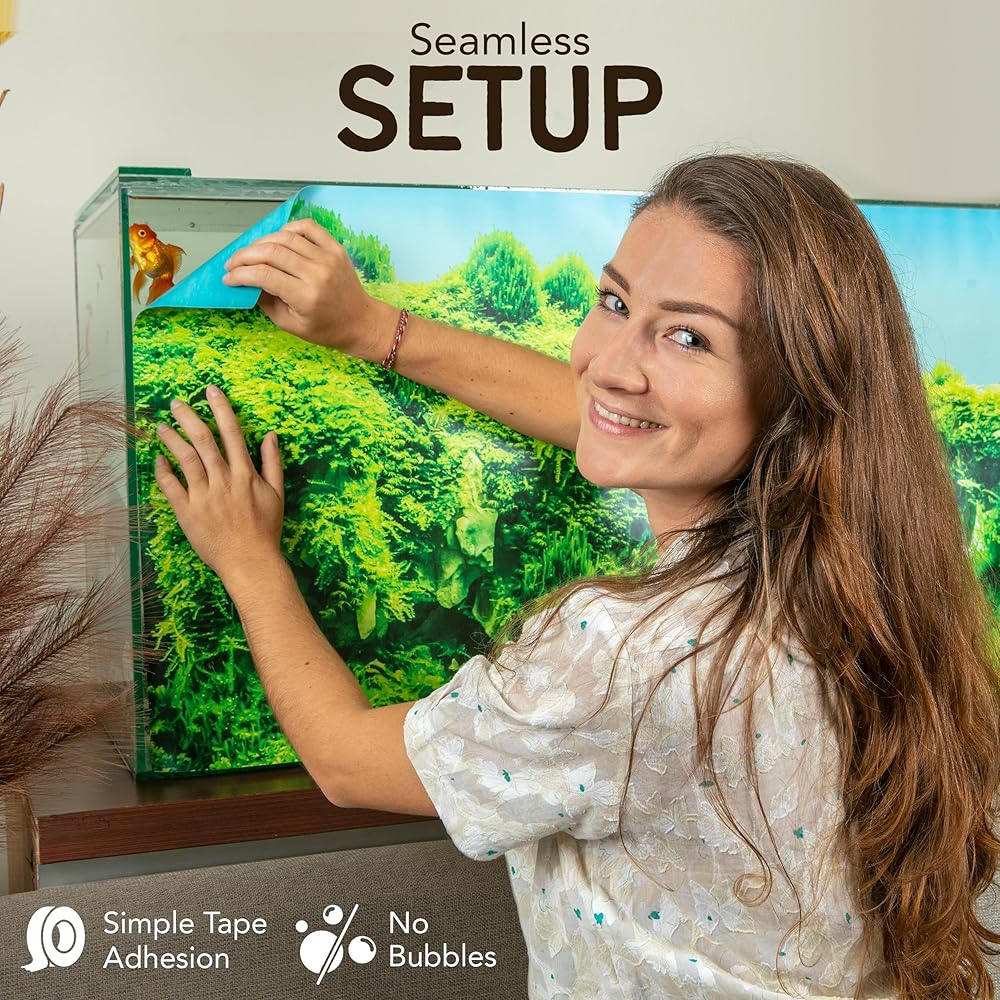 EASY INSTALL: No Bubbles. No Mess. No mucking about. Just cut the background to size and tape to the back of your fish tank. Easier than static cling. No need to use sticker or pvc adhesive. Material is tough so if you make a mistake or want to reapply you can't damage the aquarium poster.