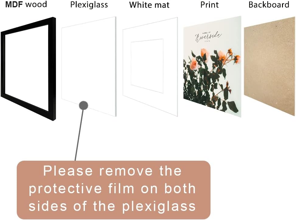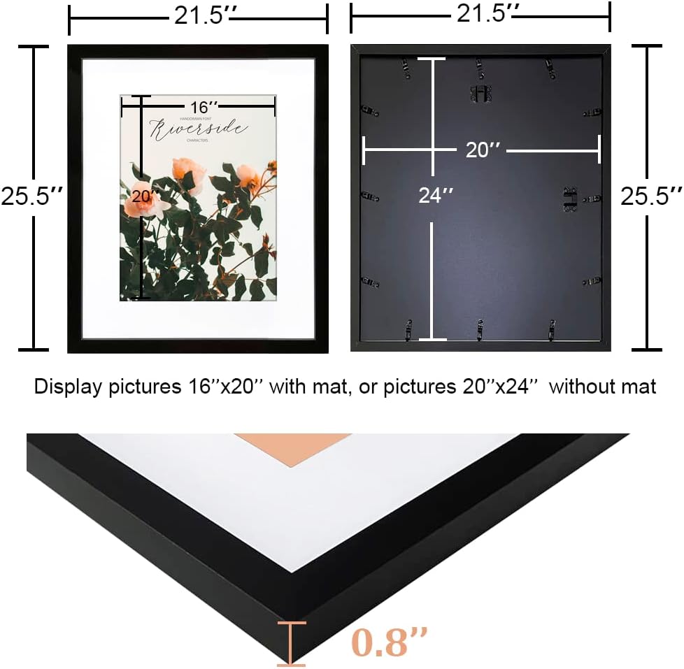 SIZE: Classical picture frames 24x24 perfect for diaplay 20x20 inch picture with mat or 24x24 inch picture without mat, plexiglass cover protect your picture from moisture or tear