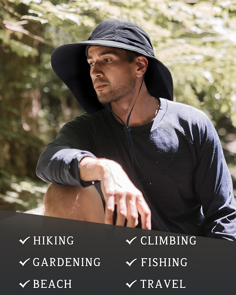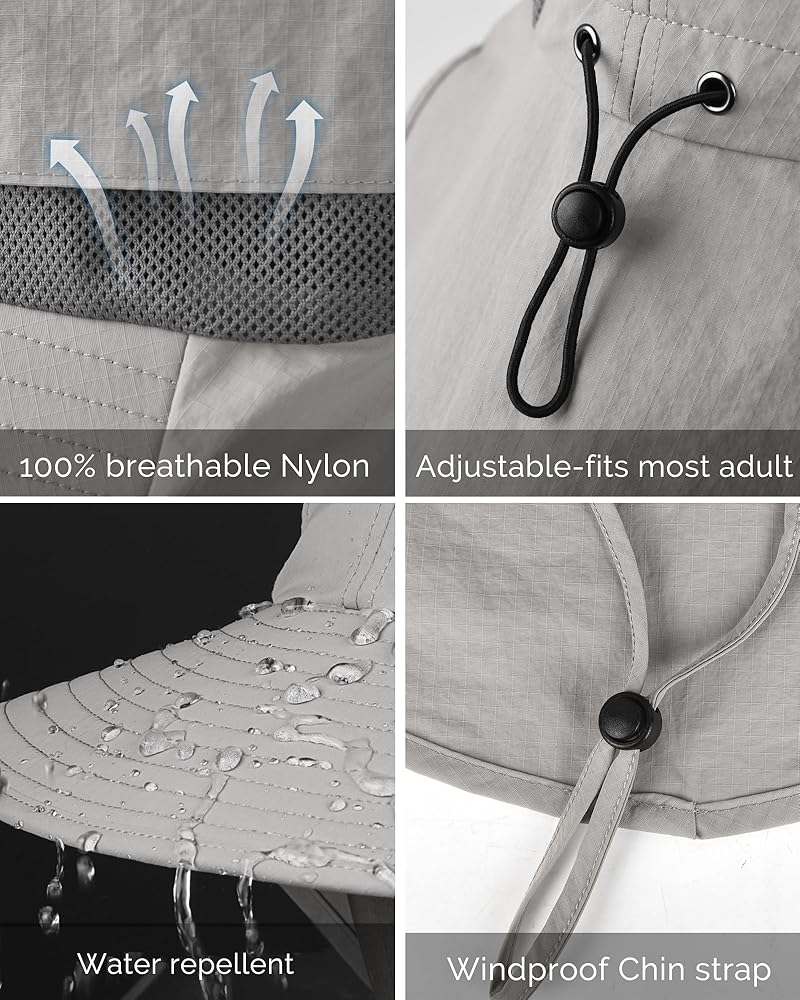 UV Protection and Windproof: Made of 100% water resistant nylon, lightweight(weighs only 3oz), quick dry and ultra-light, perfect for any summer outdoor activities fishing hiking gardening safari camping hunting cycling boating yard work etc; Besides, the removable wind chin string with a locking toggle makes it convenient for you to keep it stay in place in windy days