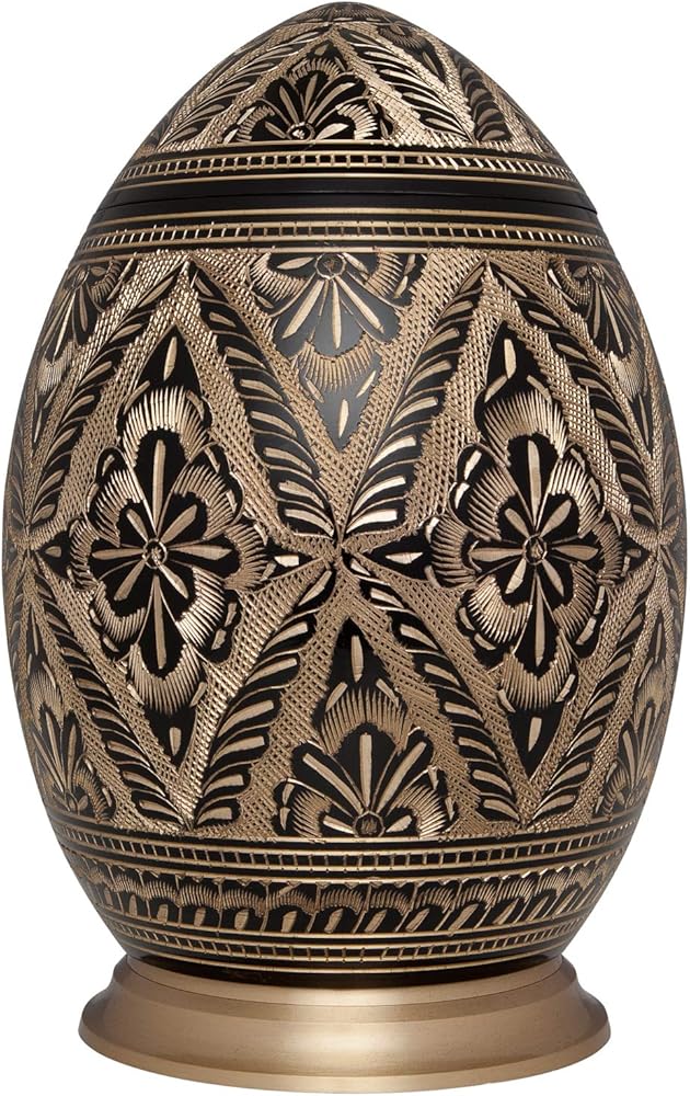 • This beautiful black urn has a delicately hand-engraved gold design with flowers and triangles, achieving a simple yet meticulous handcrafting process. The urn is sculpted in an egg shaped oval that recalls the luxury and the attention to detail found in Faberge eggs. This urn comes in a variety of styles to properly commemorate the memory of your loved one.