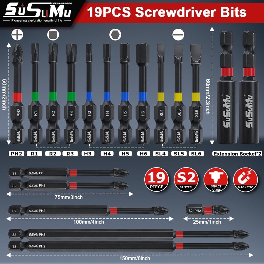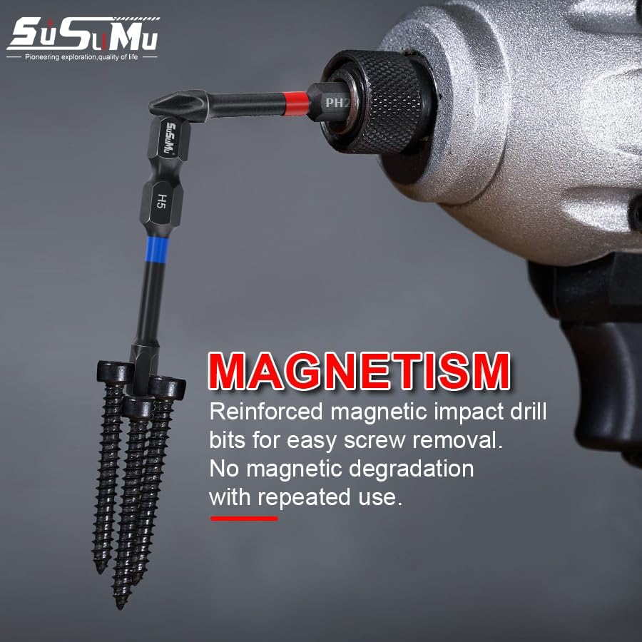 🧲 🛠️【Durable materials】:The screw driver bit set made of CNC machined tips,shock-resistant,heat treated,wear resistance,impact resistance and rust resistance industial grade S2 steel for ultimate durability, SuSuMu impact bits suitable for industrial use,phosphating black treatment for good anti-rust and anti-corrosion funcitons for long life expectancy versus standard bits.