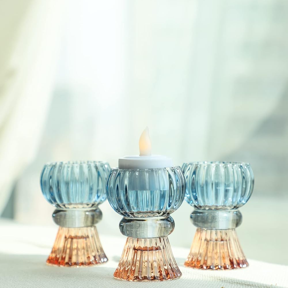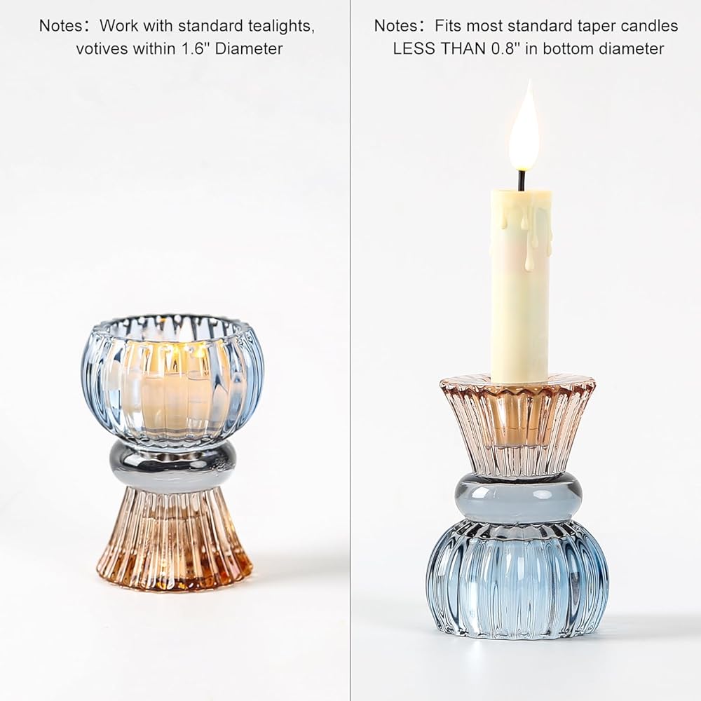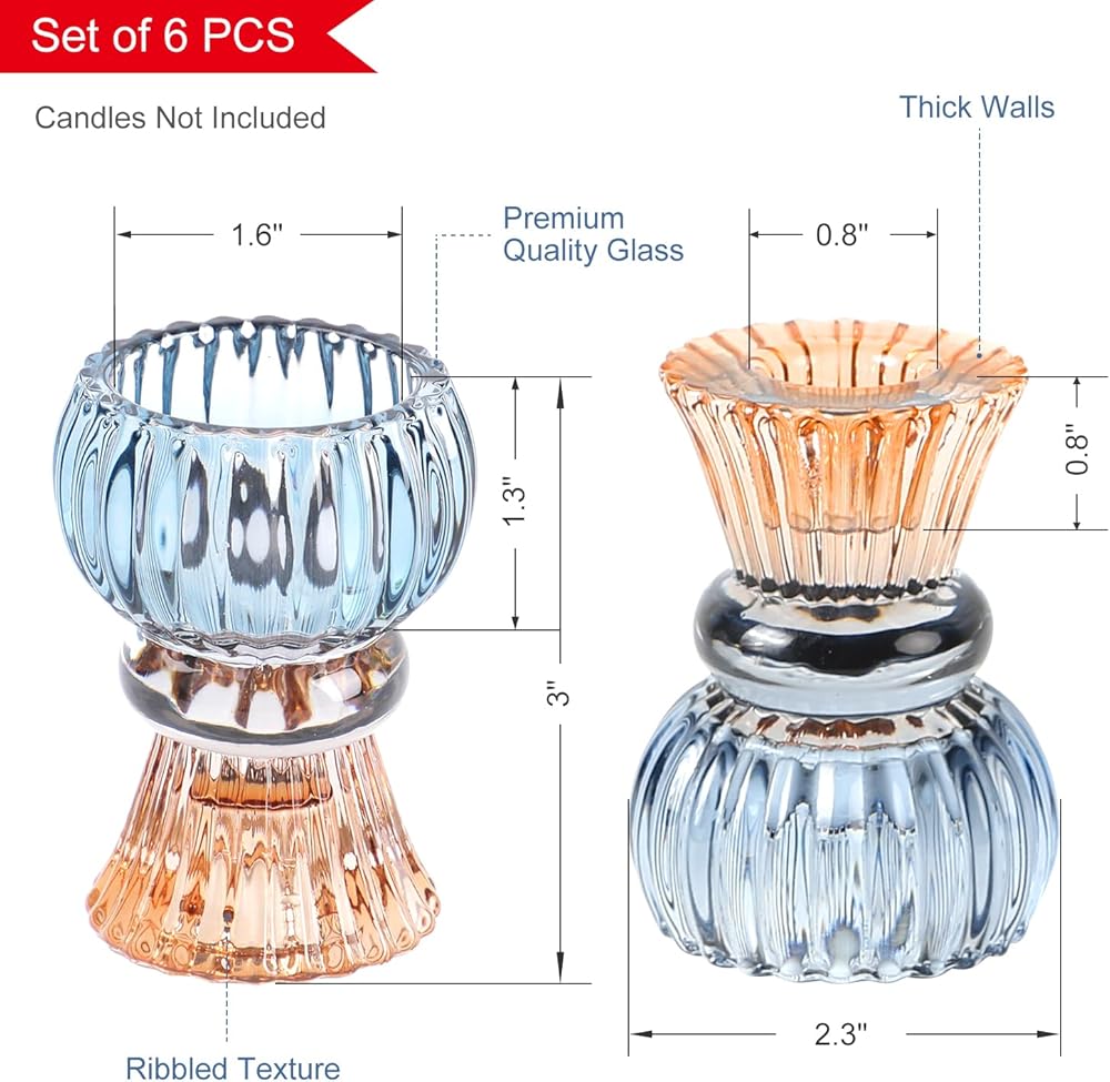 Set of 6 Amber Blue Glass Candle Holder Tealight & Taper Candle Holders, 3 inches, 2 in 1 Candlestick Holders, Home Decor Valentine Wedding Mother Gift Party Table Centerpiece