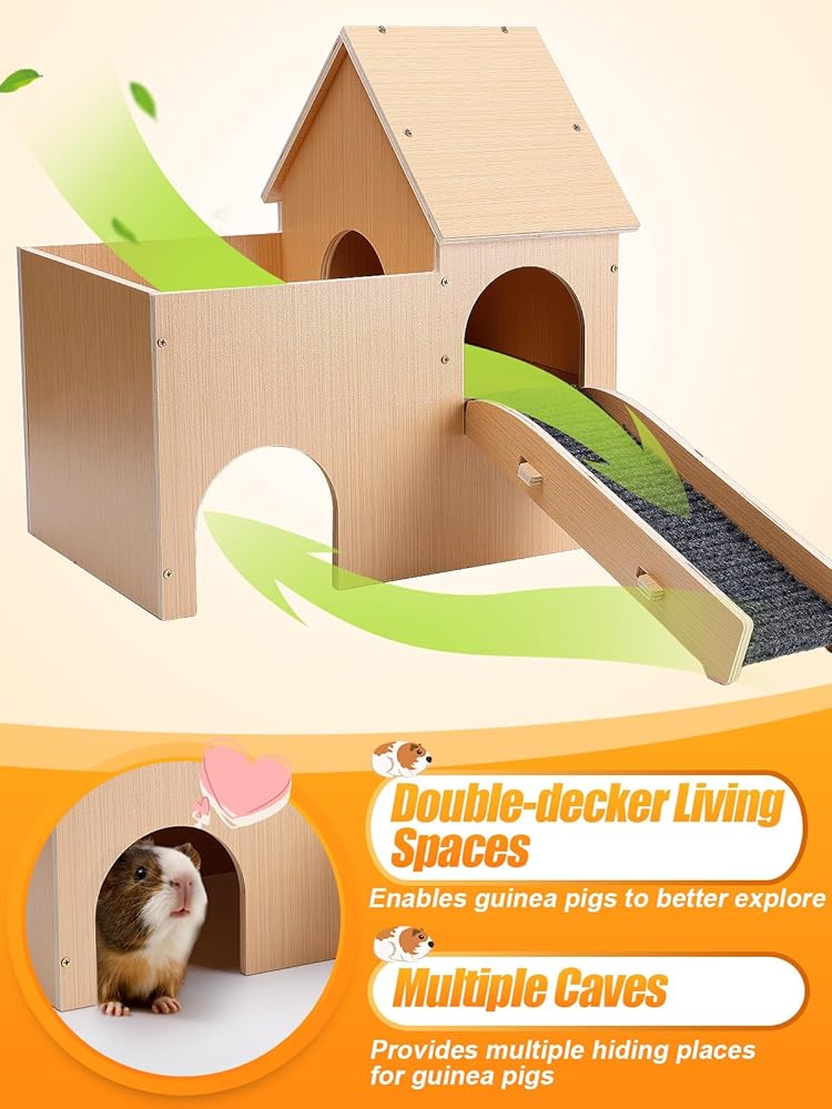 Look here, our guinea pig supplies are designed with caves and stairs, enough to satisfy your small pet's need to play hide and rest!
