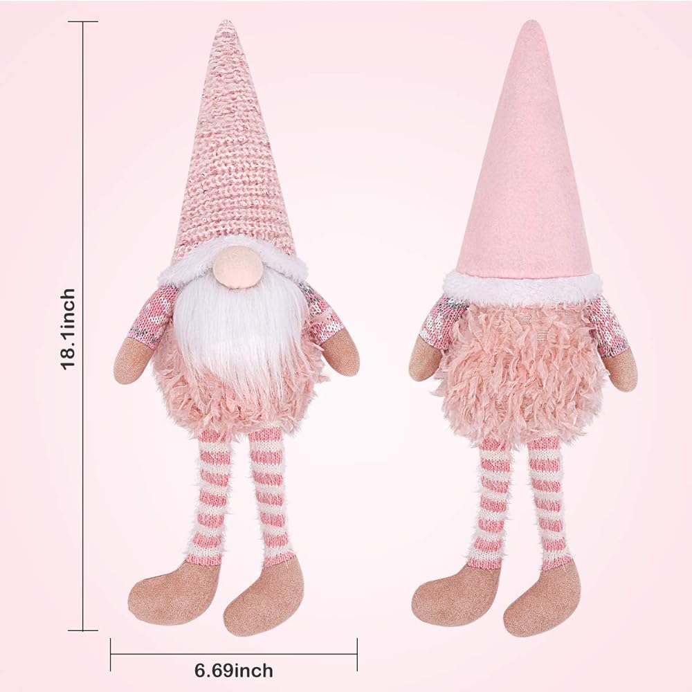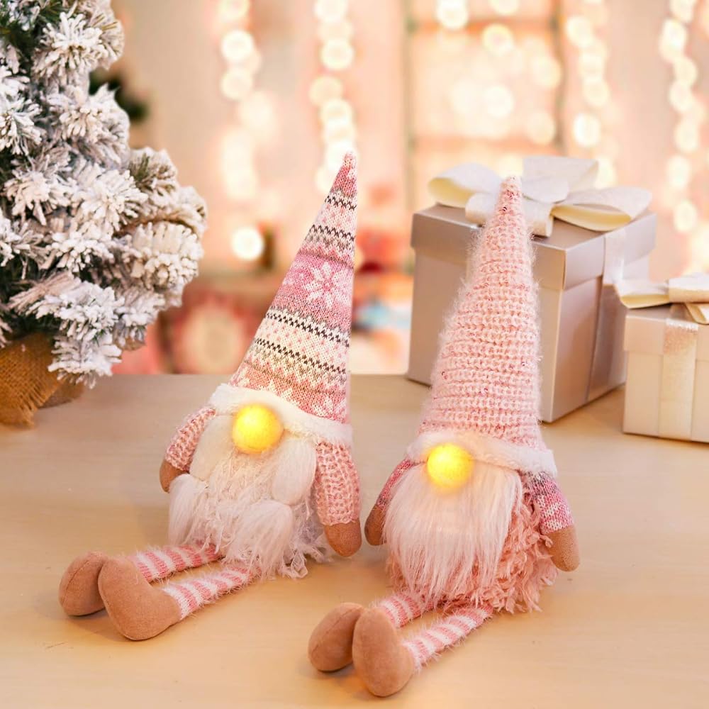 D-FantiX Pink Christmas Valentine Gnomes Decorations, 2Pack Handmade Swedish Tomte Gnome with LED Lighting Nose Scandinavian Figurine Pink Gnomes Plush Elf Valentines Day Decor Long Leg