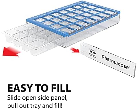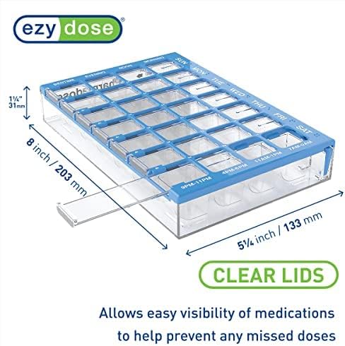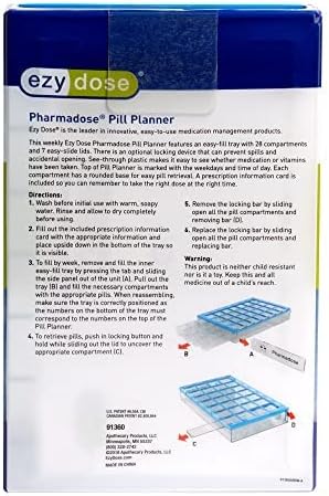 Fill your medications for the week, then slide back that day's cover to take your next dose. Locking bar holds other days' covers in place to prevent spills. Medication schedule inside tray helps you keep track of medicines and dosage. 7 DAY PILL ORGANIZER: Weekly pill sorter helps you to easily plan and distribute your daily doses EASY USE: Top lid and daily sliding covers make the planner easy to open and medication easy to retrieve MEDIUM PILL CAPACITY: Holds up to 20 pills per compartment (aspirin-sized) - 8" x 5 1/4" overall size (holds 3 fish oil tablets or 6 vitamins or 10 capsules or 22 aspirin tablets) BUILT TO LAST: Quality design, Built to withstand repeated use HEALTHY LIVING: Ezy Dose products make living healthier simply easier, Many products endorsed by the Arthritis Foundation - Assorted Colors