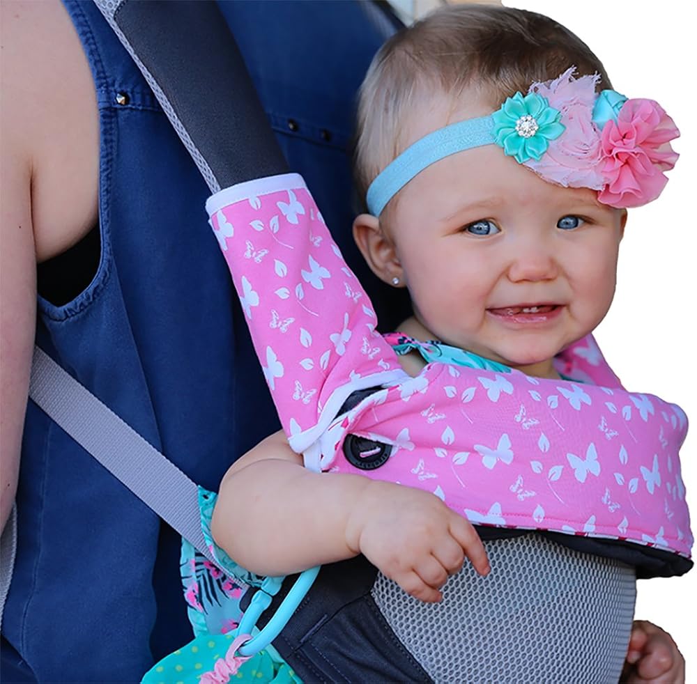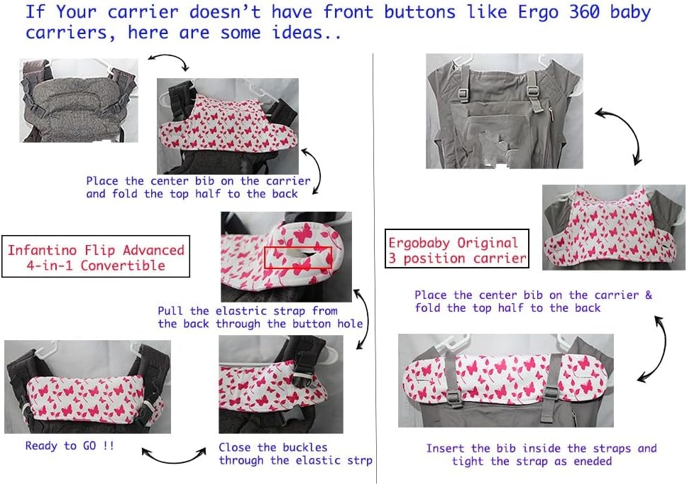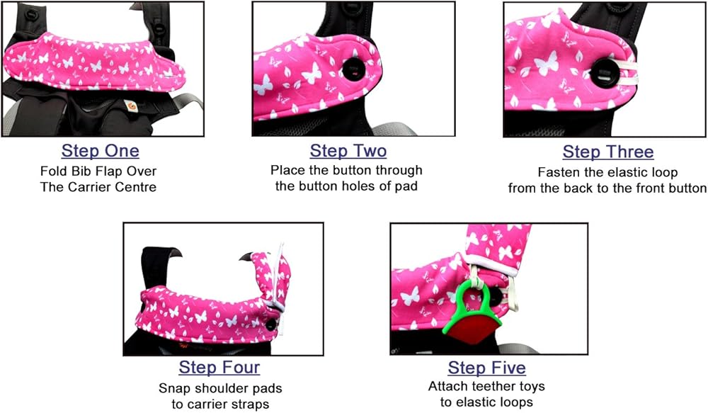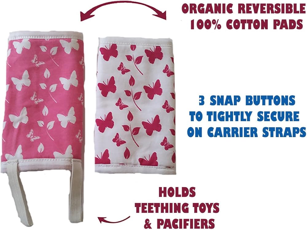 Will Stay In Place: Loops (At the top) and button holes (at the bottom) of the center piece help in securing the pad to carrier and prevent from flip-flop while getting baby IN-and-OUT as observed with others products. Shoulder pads have 2 hanging elastic straps to attach teethers, pacifiers, toys & more.