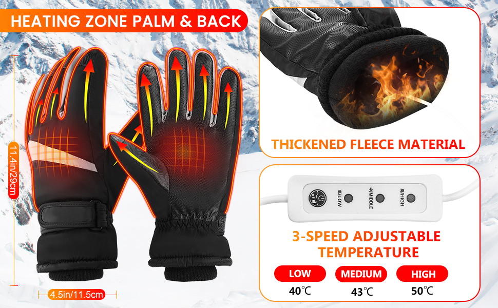 【3 Temperature Adjustable & Long USB Cable】Our heated gloves for men women are equipped 1.36m/53.5in USB cable, which is long enough for your outdoor working and sports. Winter gloves have three adjustable temperatures: high, medium, and low, the temperature can be controlled with just one switch. When not wearing gloves, we can buckle the left and right gloves together and hang them around our neck, which is very convenient when going out.