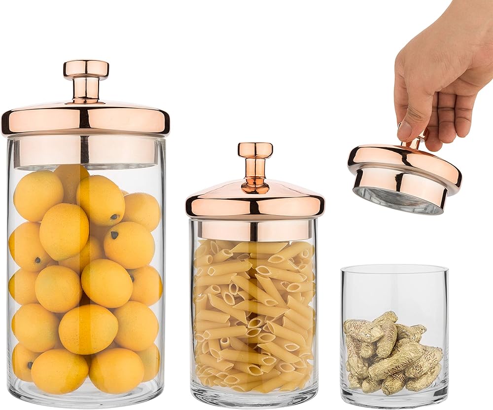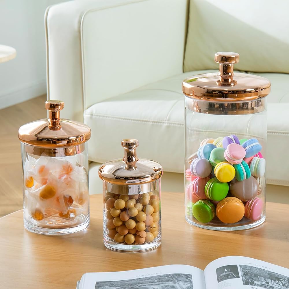 - Clear glass decorative jars perfect for storing kitchen and bathroom supplies
