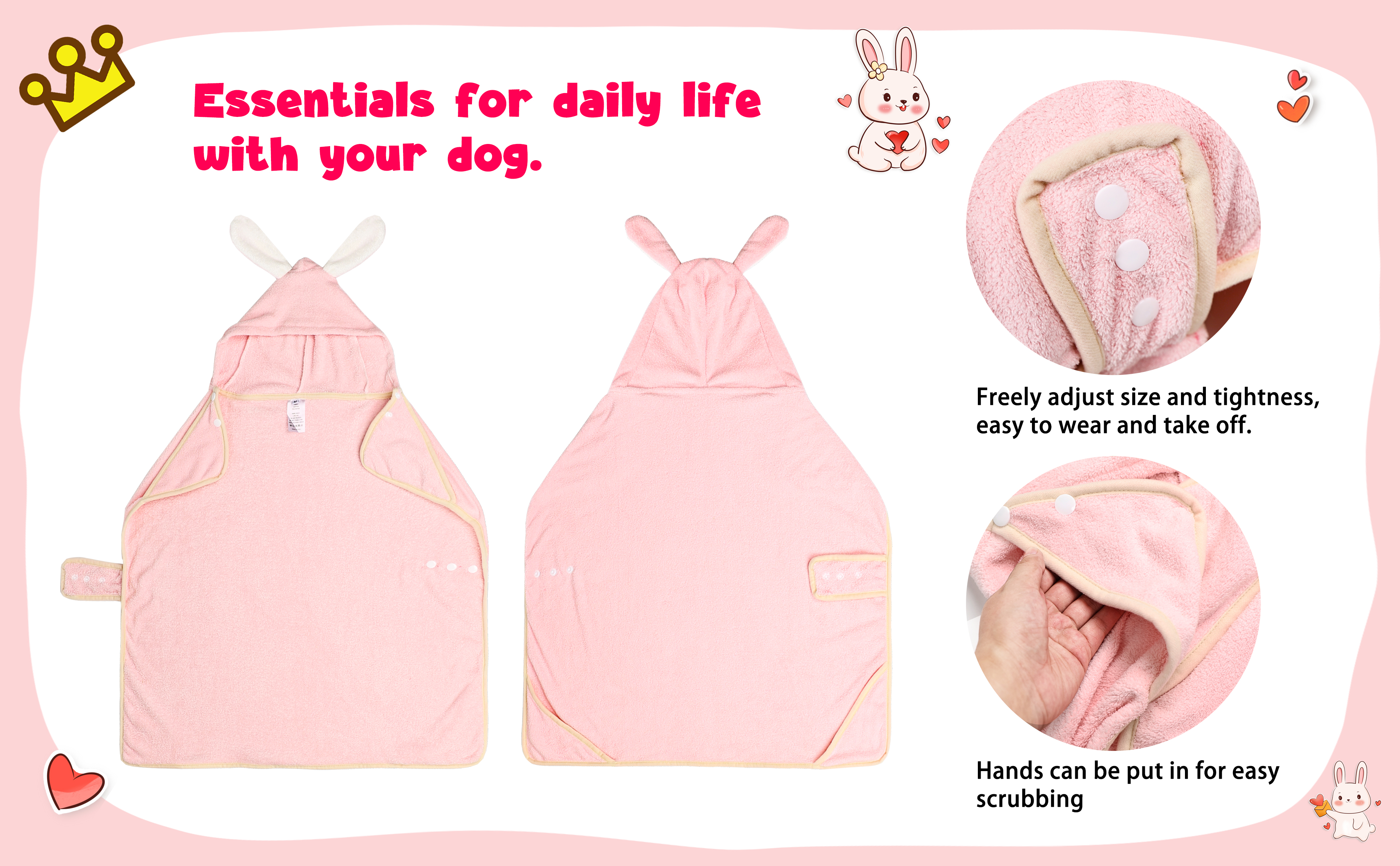 We have five sizes to choose, please refer to the size chart before ordering. Puppy bathrobe wearing is in the form of buttons, easy to put on and take off.