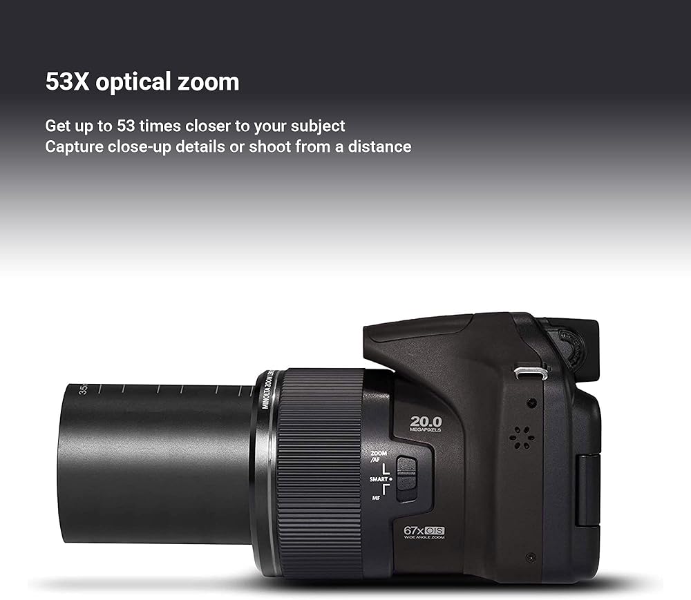 تتميز كاميرا مينولتا MN53 الرقمية السوداء بتكبير طويل المدى بمقدار 53 مرة بالإضافة إلى إمكانيات تسجيل متعددة الاستخدامات في هيكل صغير وصغير الحجم. يتيح مستشعر BSI CMOS بدقة 16.35 ميجابكسل التقاط الصور الثابتة عالية الدقة وتسجيل فيديو عالي الدقة 1080 بكسل مع ضوضاء وحساسية منخفضة من ايزو 100-3200 بالإضافة إلى فيديو اس دي 640 × 480 بكسل بسرعة 120 إطار في الثانية. يغطي التكبير الواسع نطاق البعد البؤري المكافئ 24-1256 ملم للعمل مع الأهداف القريبة والبعيدة ويكمله تقريب رقمي 4 أضعاف يحدد الإجمالي المجمع بتكبير 212x. يساعد التثبيت البصري للصورة على تقليل مظهر اهتزاز الكاميرا لالتقاط صور أكثر وضوحًا باليد، والذي يمكن أن يكون ذا أهمية قصوى عند التصوير بأطوال بؤرية طويلة للغاية. يتميز الجزء الخلفي من الكاميرا بشاشة ال سي دي 3 انش 460 كلفن نقطة لسهولة مراجعة وتكوين صورك.
